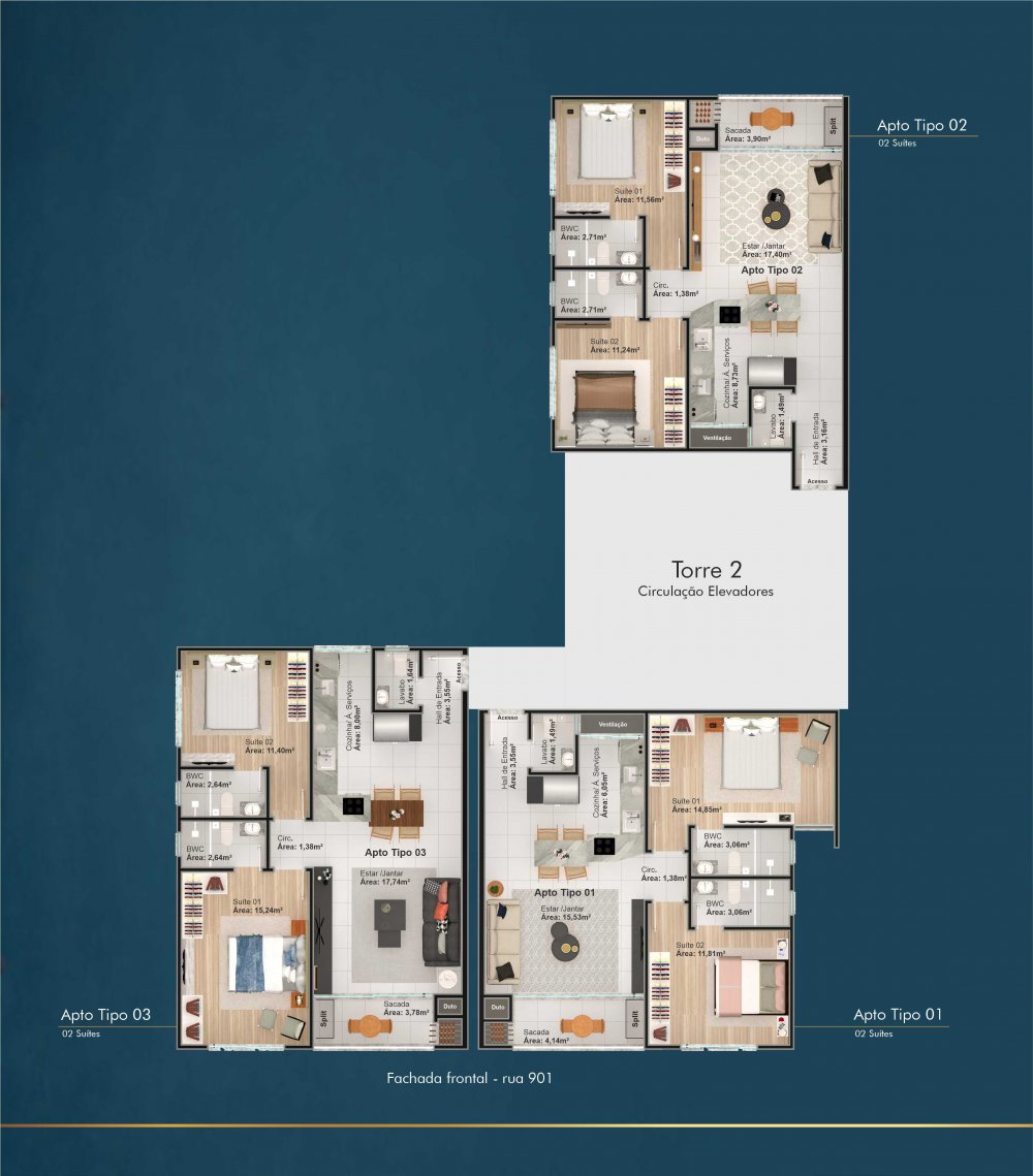 Os apartamentos contam com plantas que variam entre 80m² a 105m² de área privativa aproximadas.