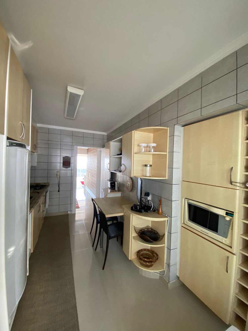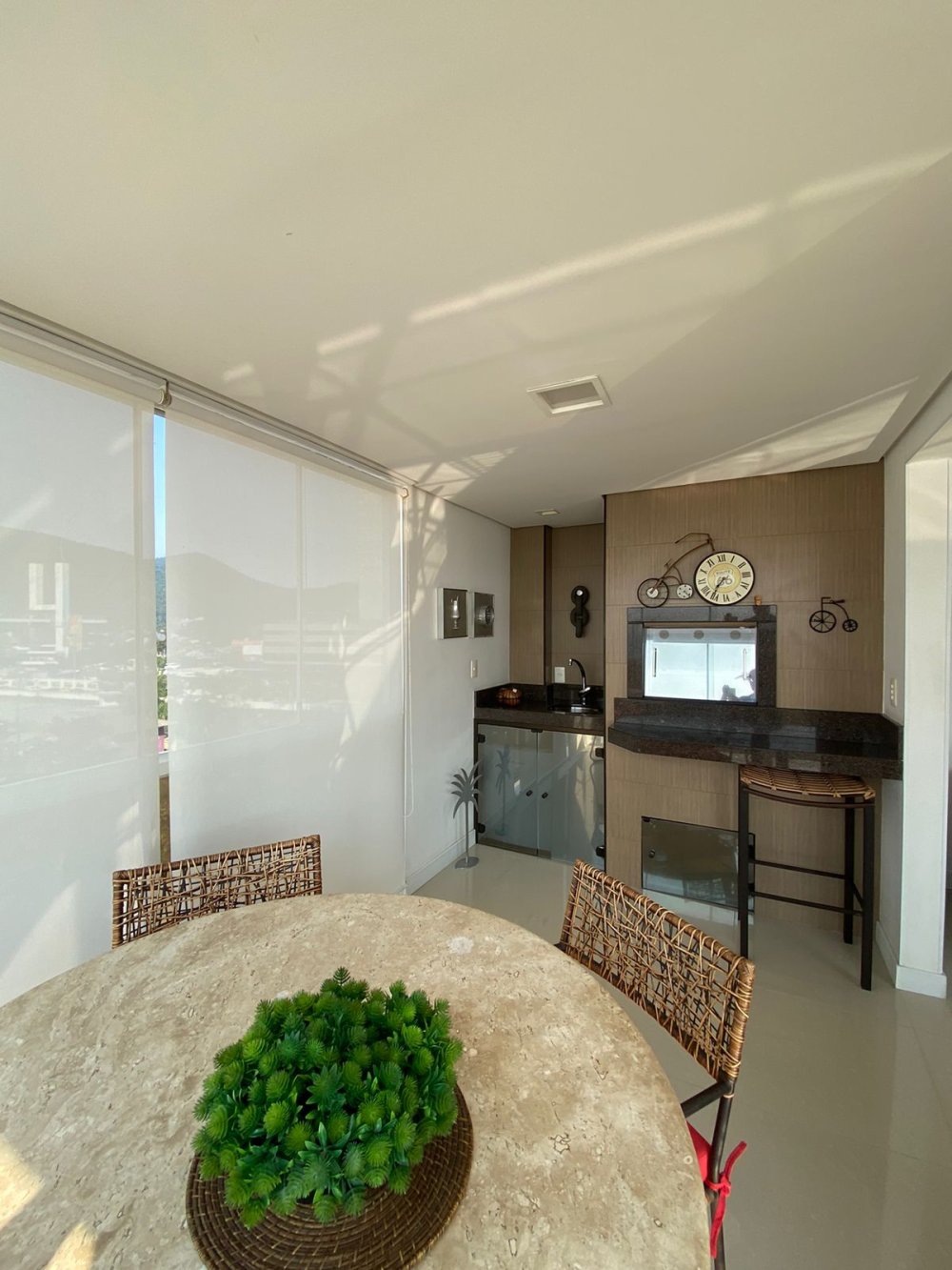 Sacada com Vista para o Mar: Ampla sacada com churrasqueira a carvão, ideal para desfrutar de uma refeição ao ar livre com a brisa do mar.