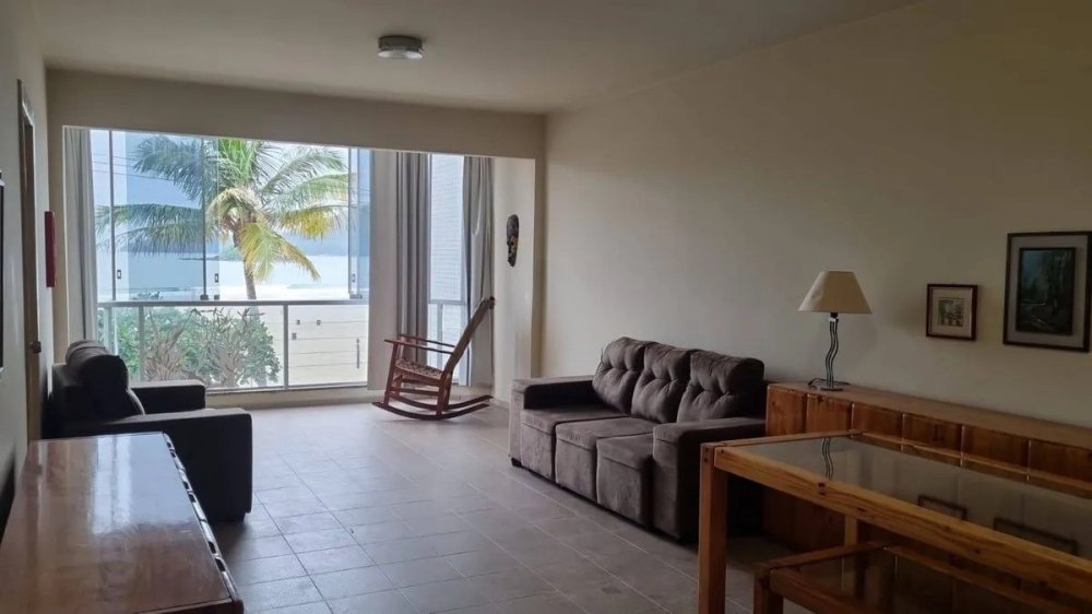 A sala se estende até a sacada com vista direta da orla central