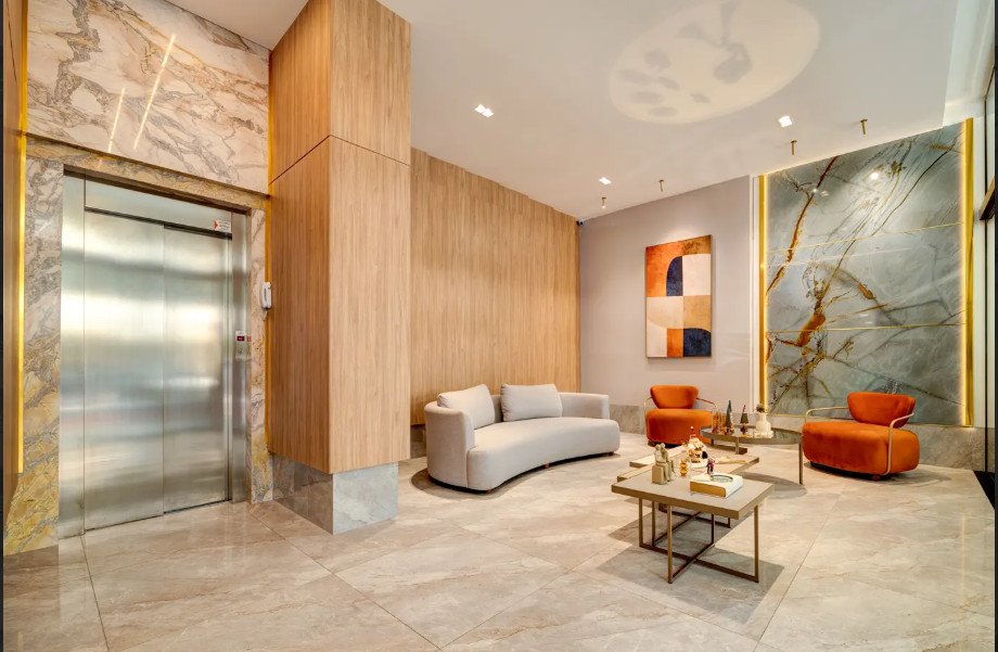O hall de entrada é finamente decorado, refletindo o alto padrão de acabamento, enquanto a segurança é garantida por uma guarita com monitoramento 24 horas.
