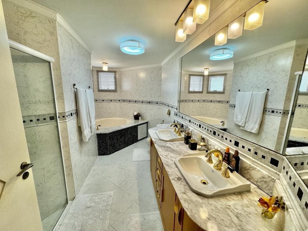 As suítes são projetadas para o conforto absoluto, com móveis planejados e acesso direto às sacadas. O banheiro da suíte master é um espetáculo à parte, com acabamentos em mármore, dupla cuba e uma banheira de hidromassagem que oferece total relaxamento.