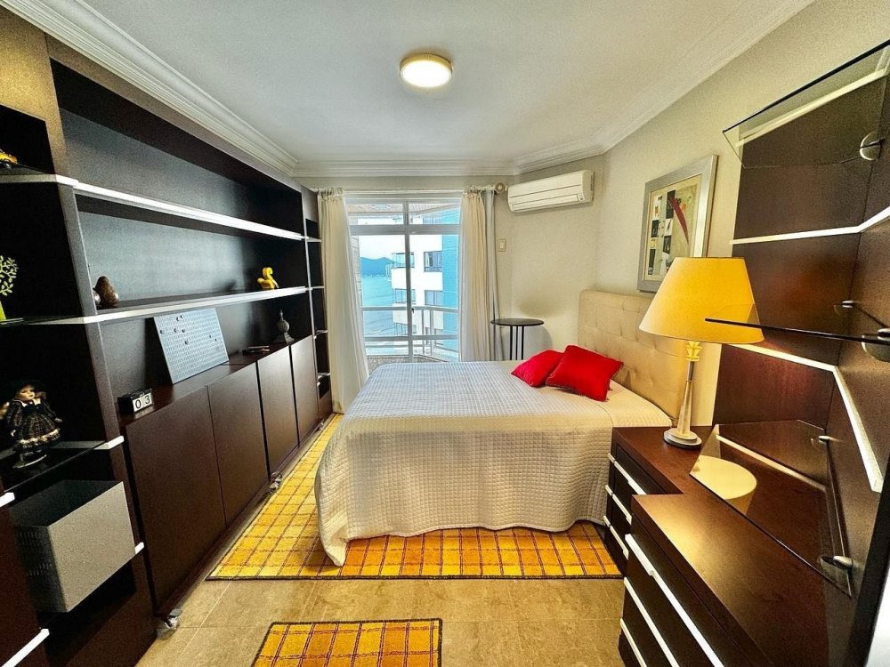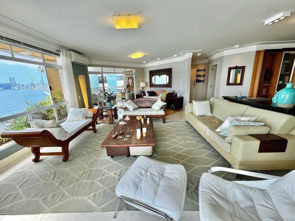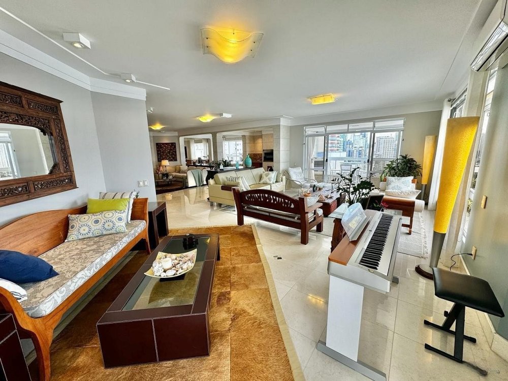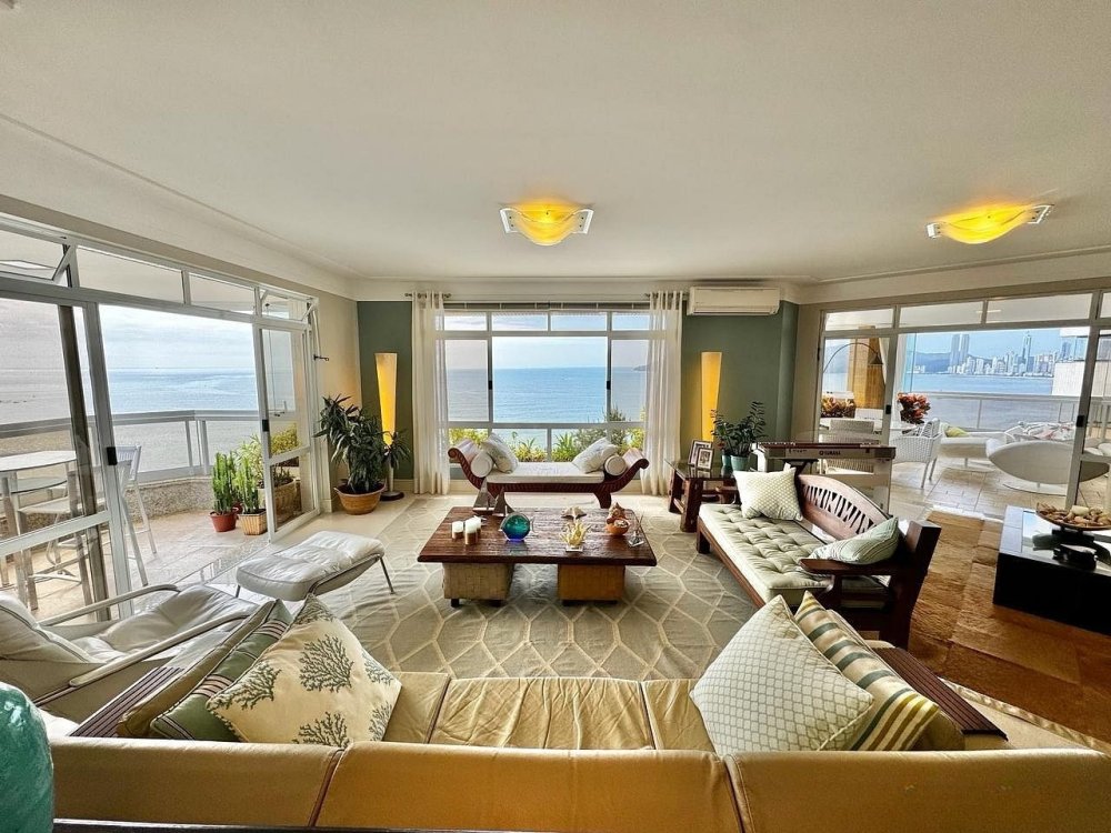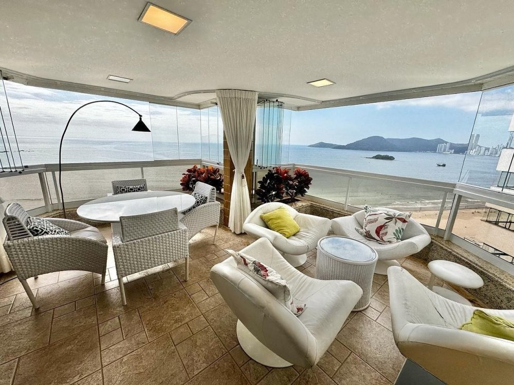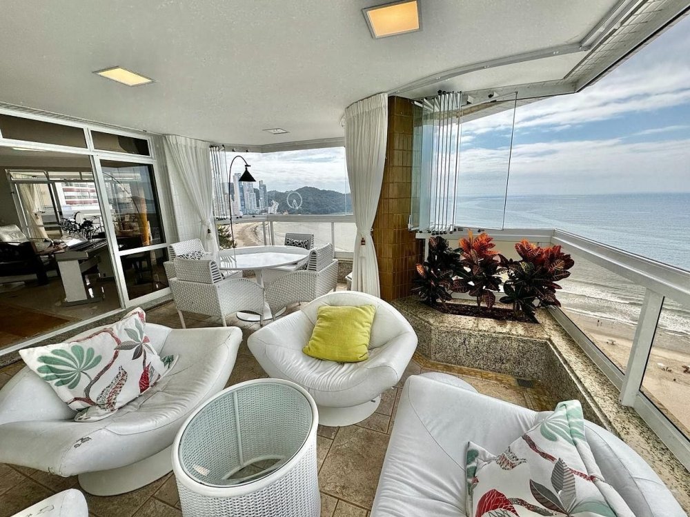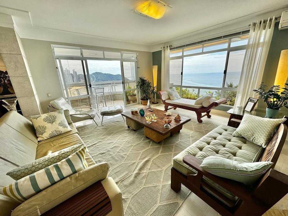 A sala é ampla e bem iluminada, decorada com móveis que mesclam conforto e sofisticação. A integração com a sacada oferece um ambiente perfeito para relaxar ou admirar a vista deslumbrante da orla de Balneário Camboriú.