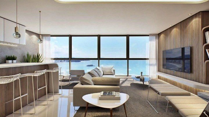 - Living com espaço gourmet e uma vista privilegiada para o mar;