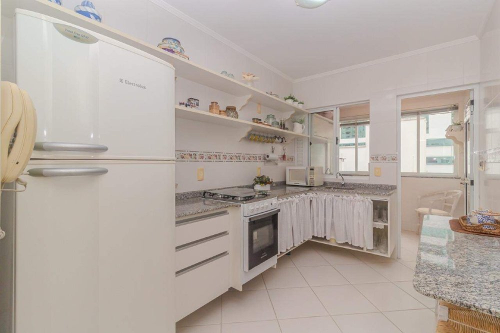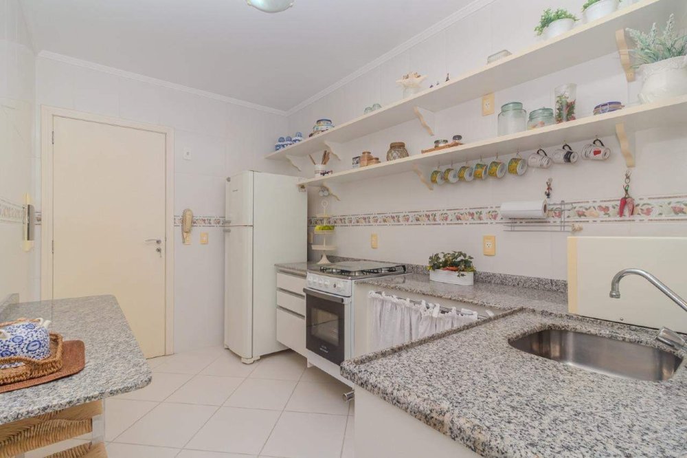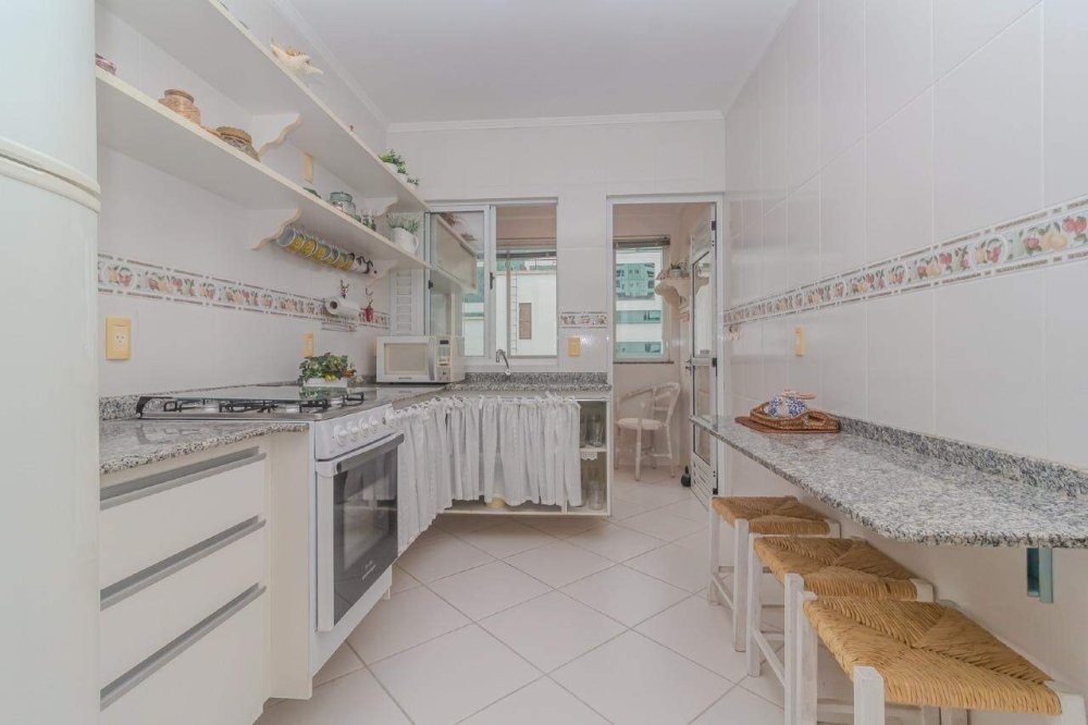 A cozinha funcional possui bancadas em granito, armários planejados e prateleiras abertas, garantindo organização e praticidade. O espaço perfeito para preparar suas refeições com conforto e estilo.