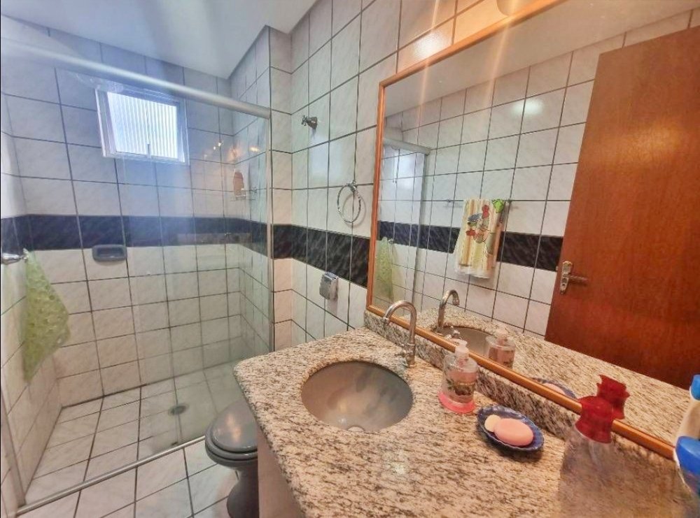 Os banheiros seguem um design prático, com azulejos claros, pias com tampo de granito e box de vidro, garantindo funcionalidade e fácil manutenção.