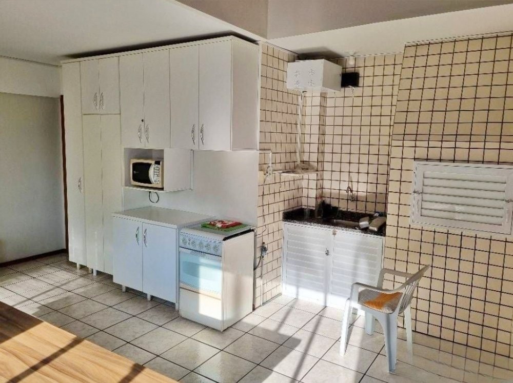 A cozinha tem um design funcional, com armários brancos que proporcionam praticidade e espaço para armazenamento. O ambiente é iluminado e conta com uma mesa redonda, ideal para pequenas refeições.