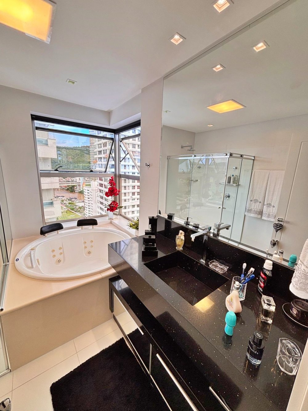 Banheiro sofisticado, com bancada em preto absoluto, duas cubas, box espaçoso e uma banheira de hidromassagem com janelas generosas - um verdadeiro SPA com vista da cidade e da natureza