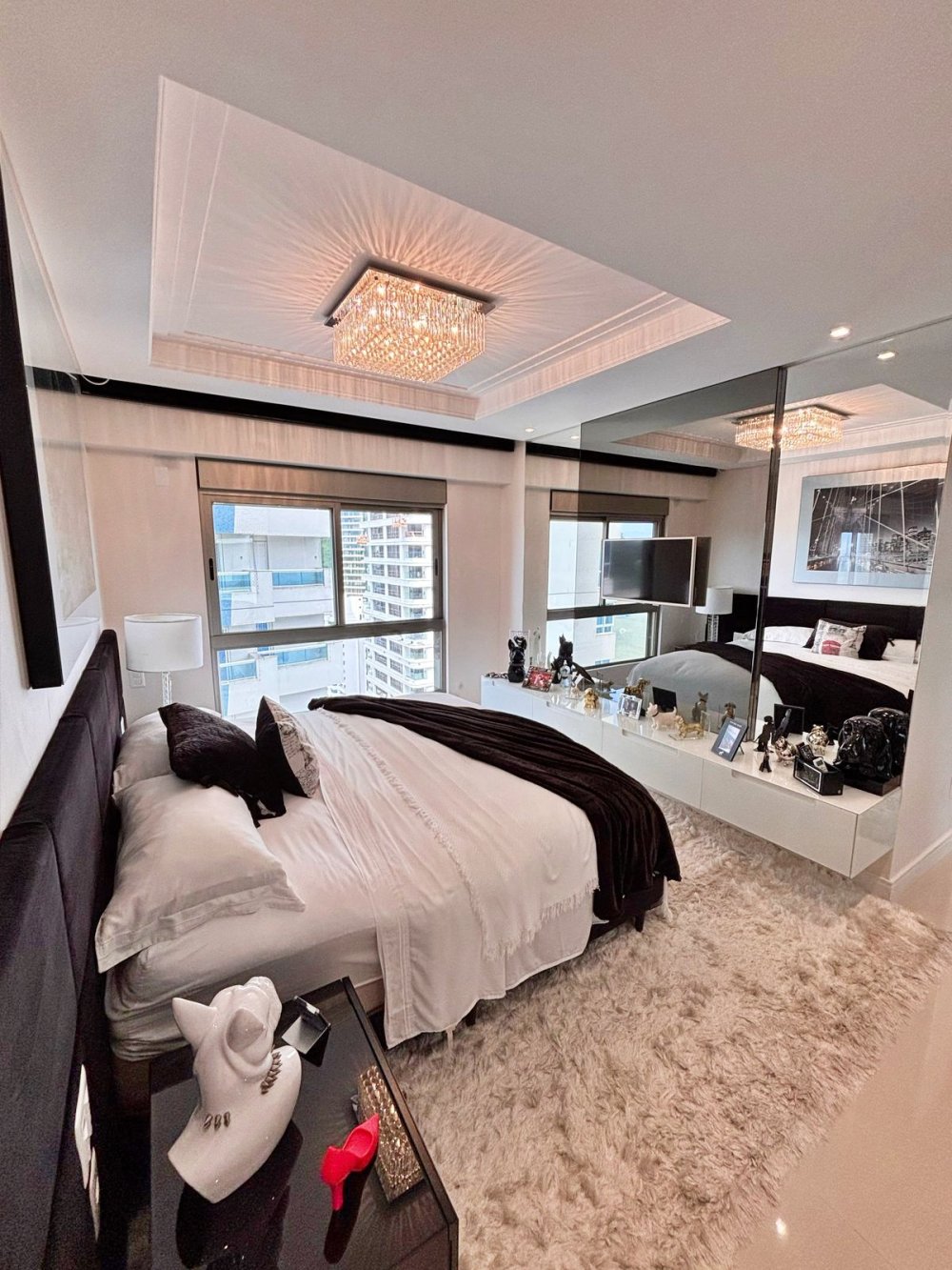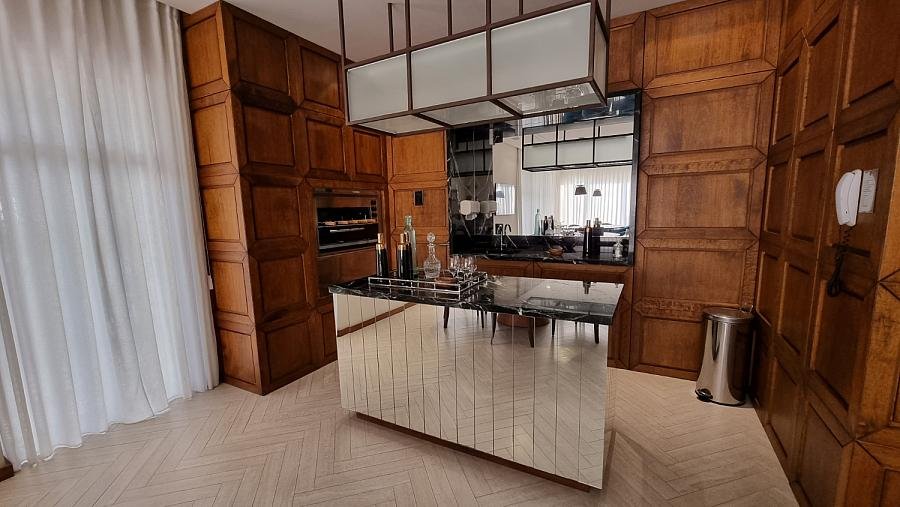 Painéis espelhados e móveis sob medida, criando uma atmosfera de amplitude e bom gosto.