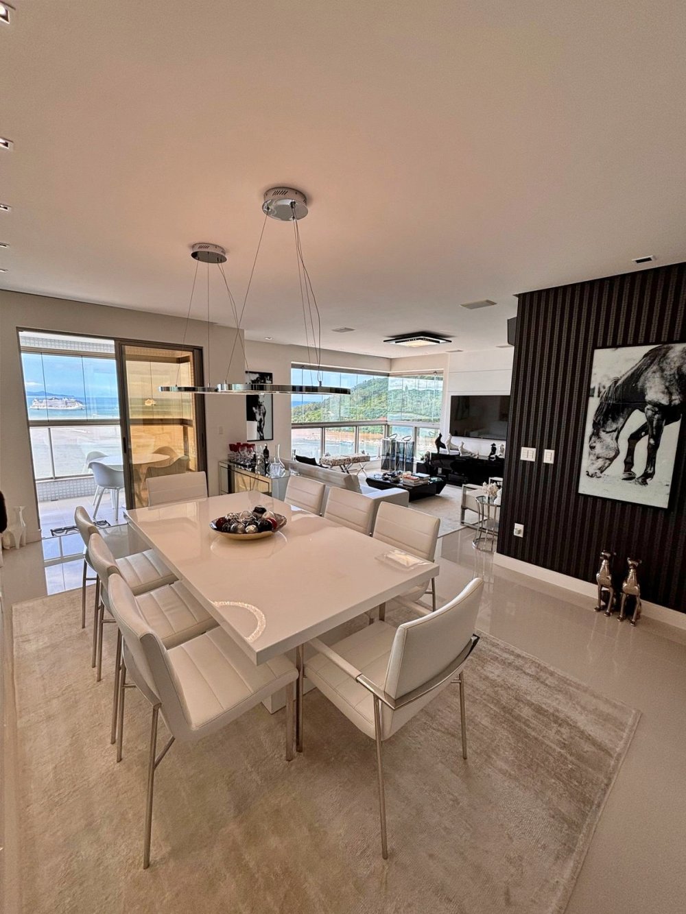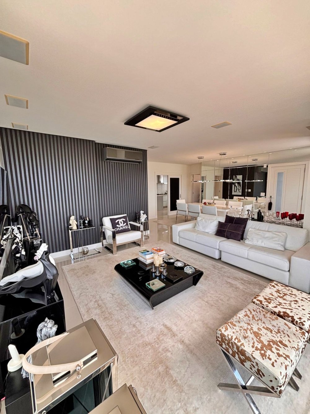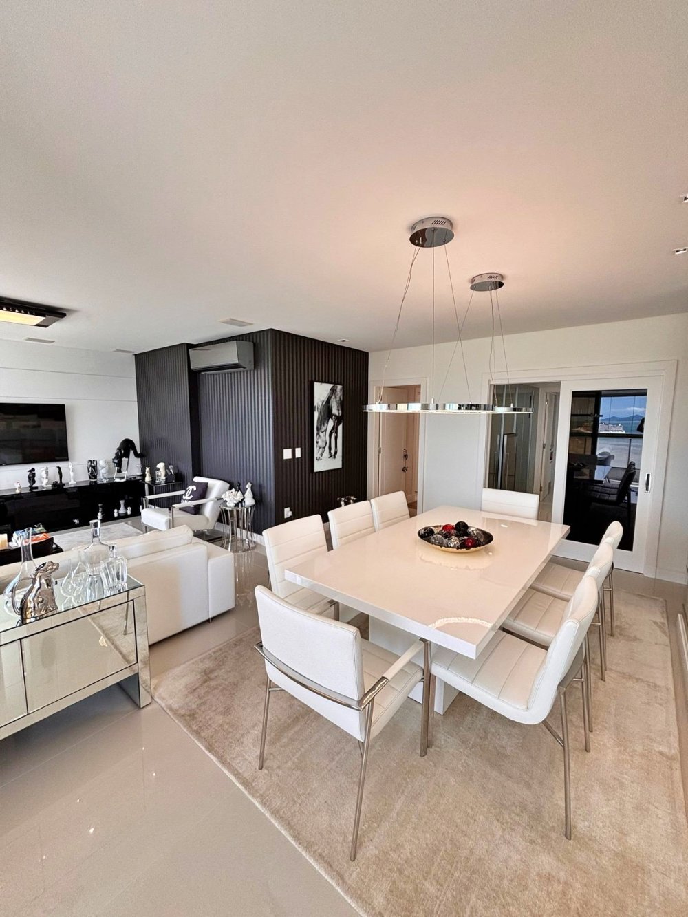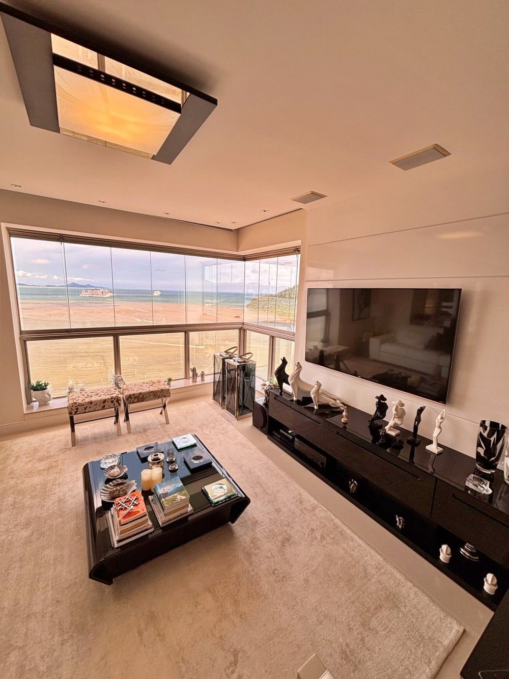 A primeira imagem que se forma ao entrar é a de um living amplo, banhado por luz natural, com janelas que emolduram o azul do mar como uma obra de arte viva. A decoração elegante em tons neutros e os móveis de design traduzem sofisticação sem exageros - o verdadeiro luxo silencioso que seu estilo de vida exige.