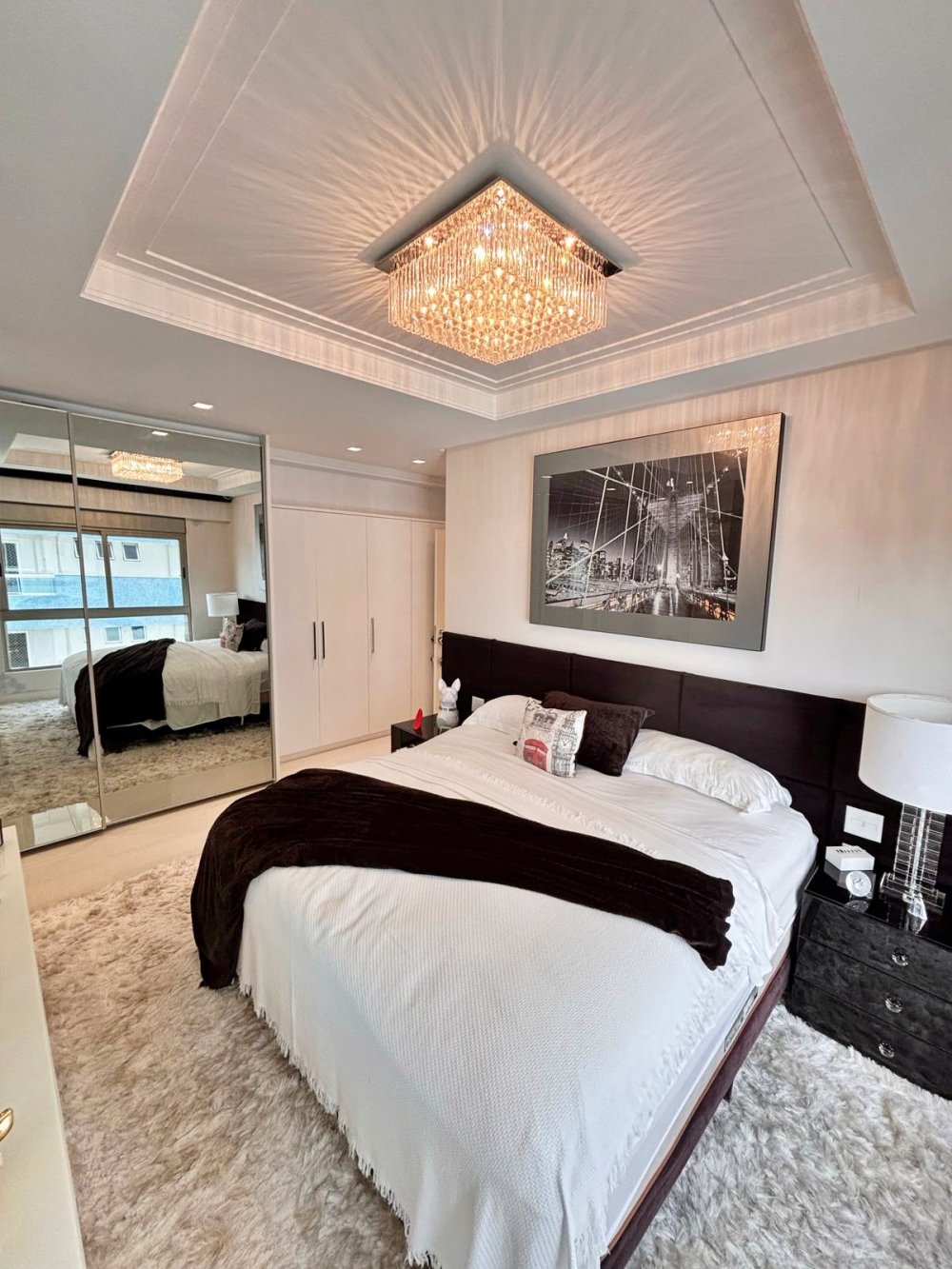Quarto amplo com cama king-size, projeto luminotécnico e armários espelhados