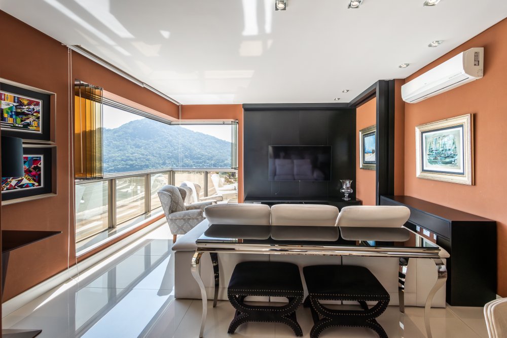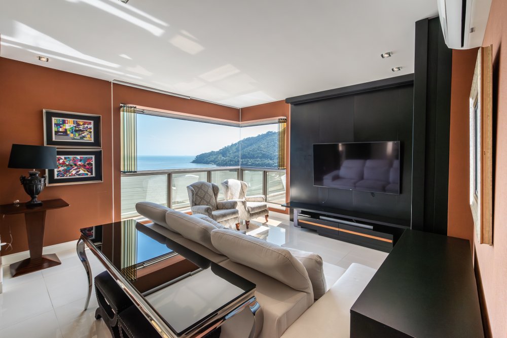 O living principal é um convite ao conforto, com mobiliário refinado, uma paleta de cores sofisticada e um layout que integra sala de estar, jantar e varanda gourmet. As grandes esquadrias de vidro garantem uma conexão ininterrupta com o cenário privilegiado do mar e da cidade.