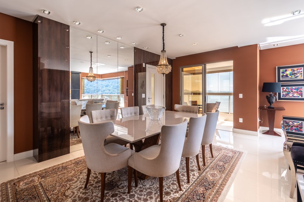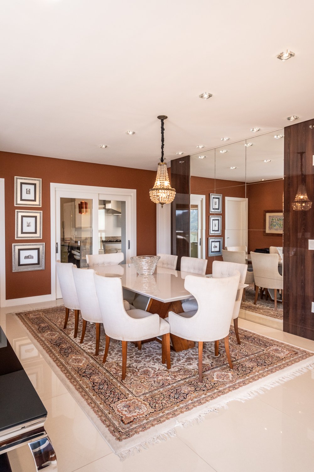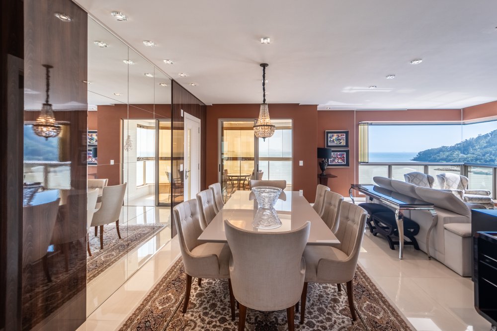 - Sala de jantar elegante, decorada com um imponente lustre e espelhos estrategicamente posicionados para ampliar a sensação de espaço.