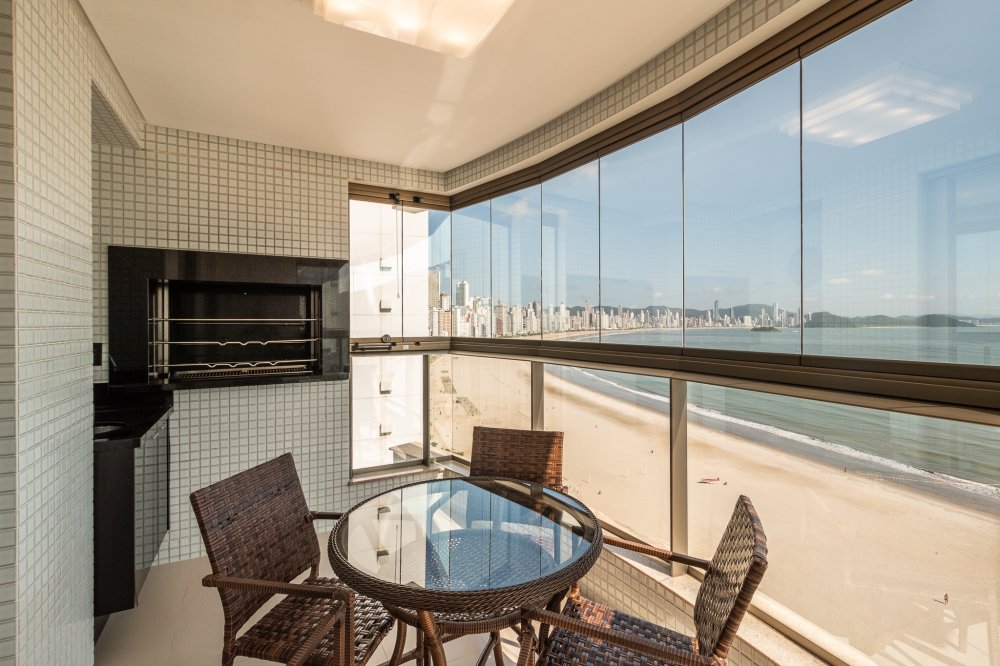 A varanda gourmet é um dos espaços mais encantadores deste imóvel. Totalmente envidraçada, proporciona um ambiente perfeito para apreciar o nascer do sol com um café da manhã tranquilo ou receber amigos para um jantar com a brisa do mar ao fundo. A churrasqueira, estrategicamente posicionada, complementa este espaço de convivência, tornando cada momento ainda mais especial.