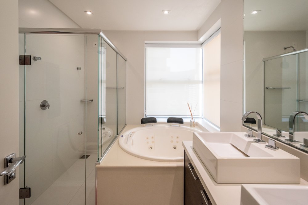 - Banheiros revestidos com materiais nobres, cubas esculpidas e acabamentos de design sofisticado.