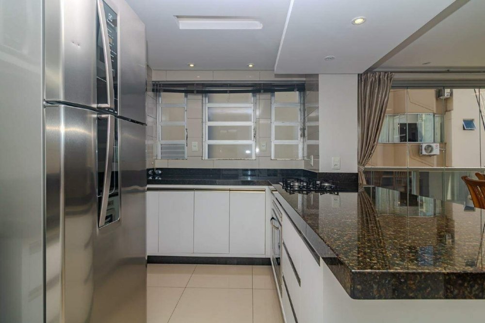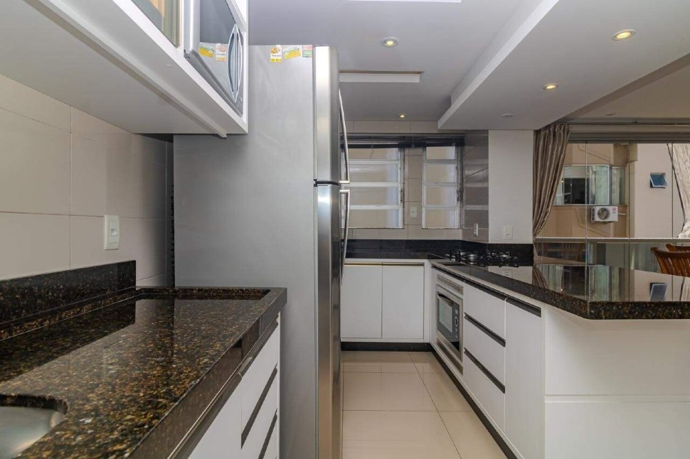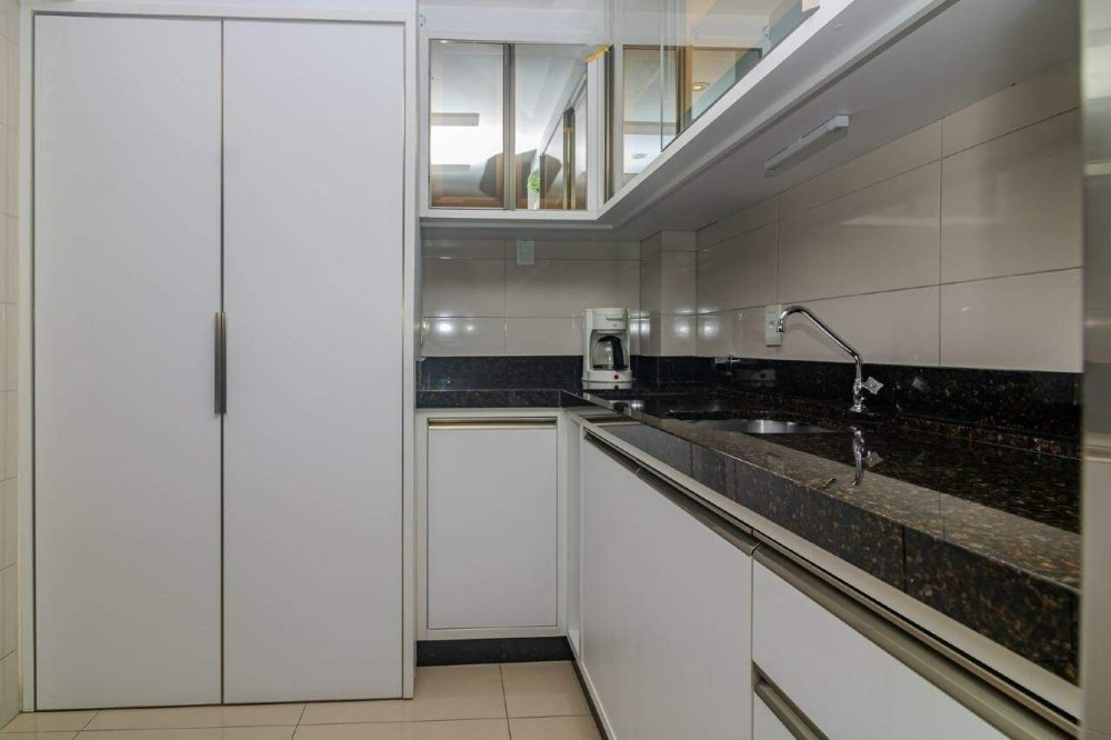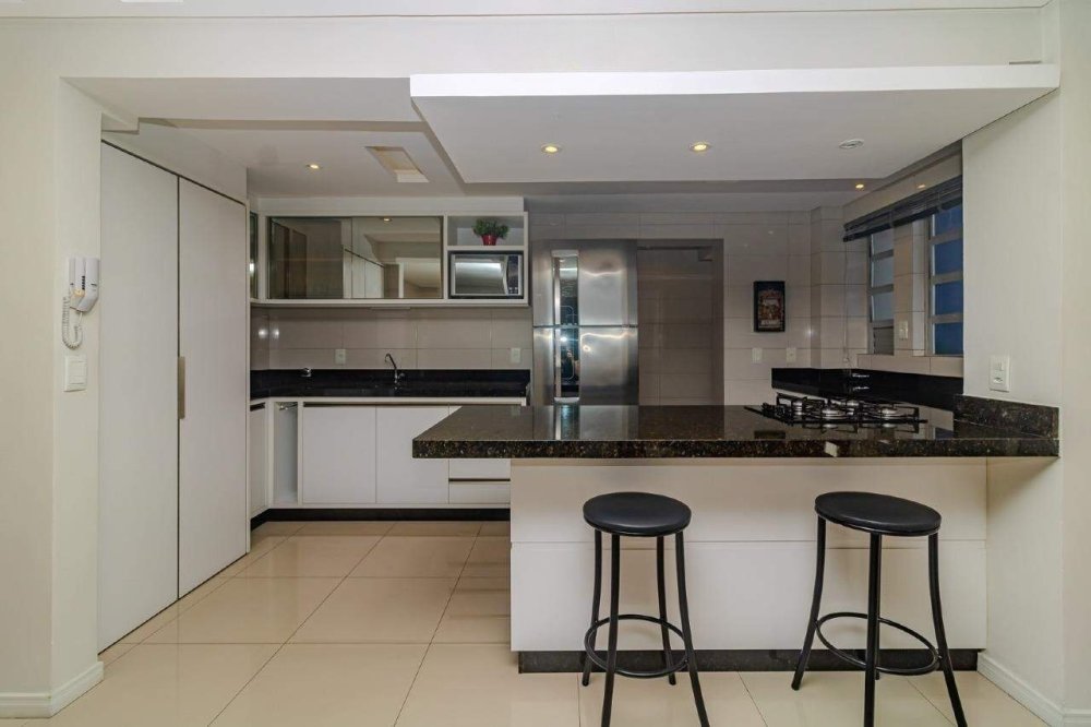 A cozinha americana é completa e planejada, com bancada em granito e armários sob medida, conectando-se de forma harmônica à área social. A área de serviço é independente e funcional, com ótimo aproveitamento de espaço e ventilação natural.