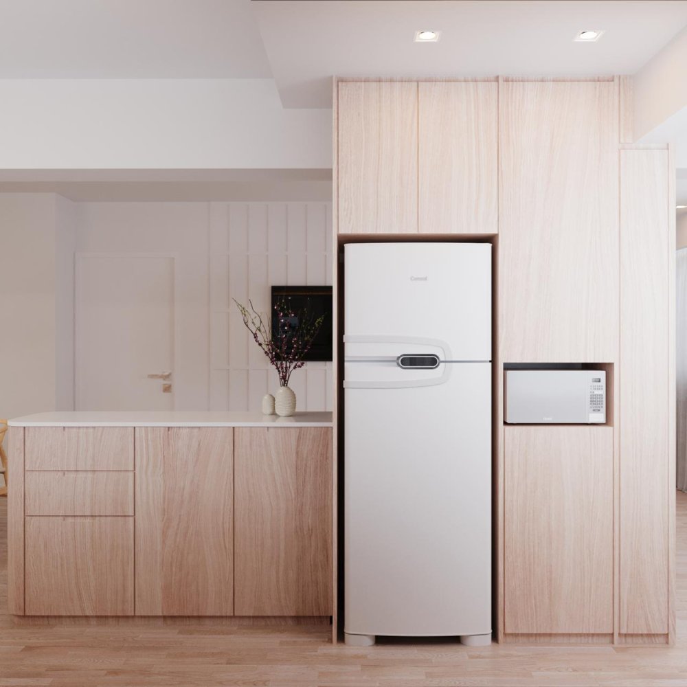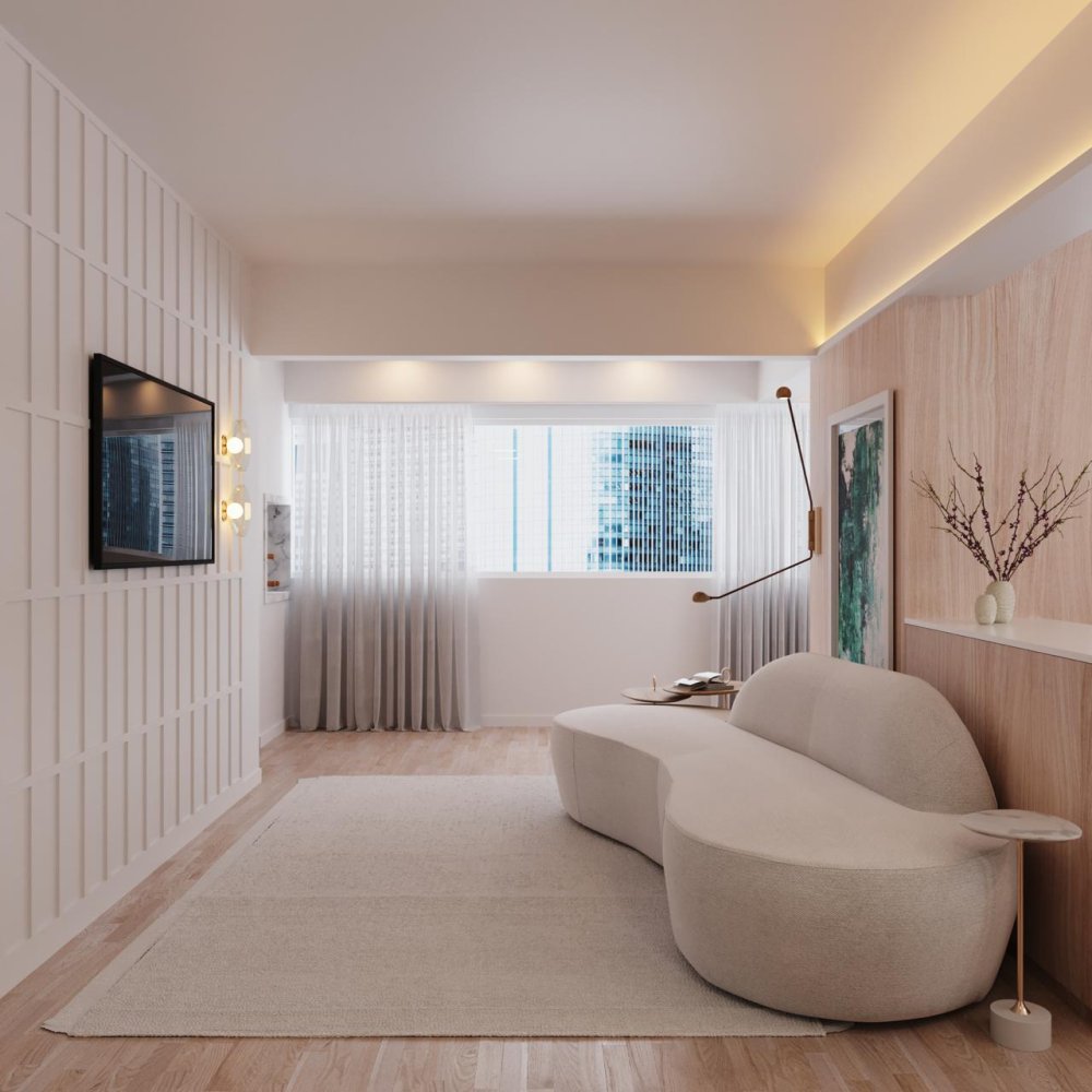 Ambiente amplo e iluminado, com conceito aberto que favorece a convivência. O piso vinílico amadeirado traz elegância, enquanto o forro de gesso com iluminação LED embutida reforça o ar moderno. A paleta neutra valoriza a amplitude e permite total liberdade decorativa.
