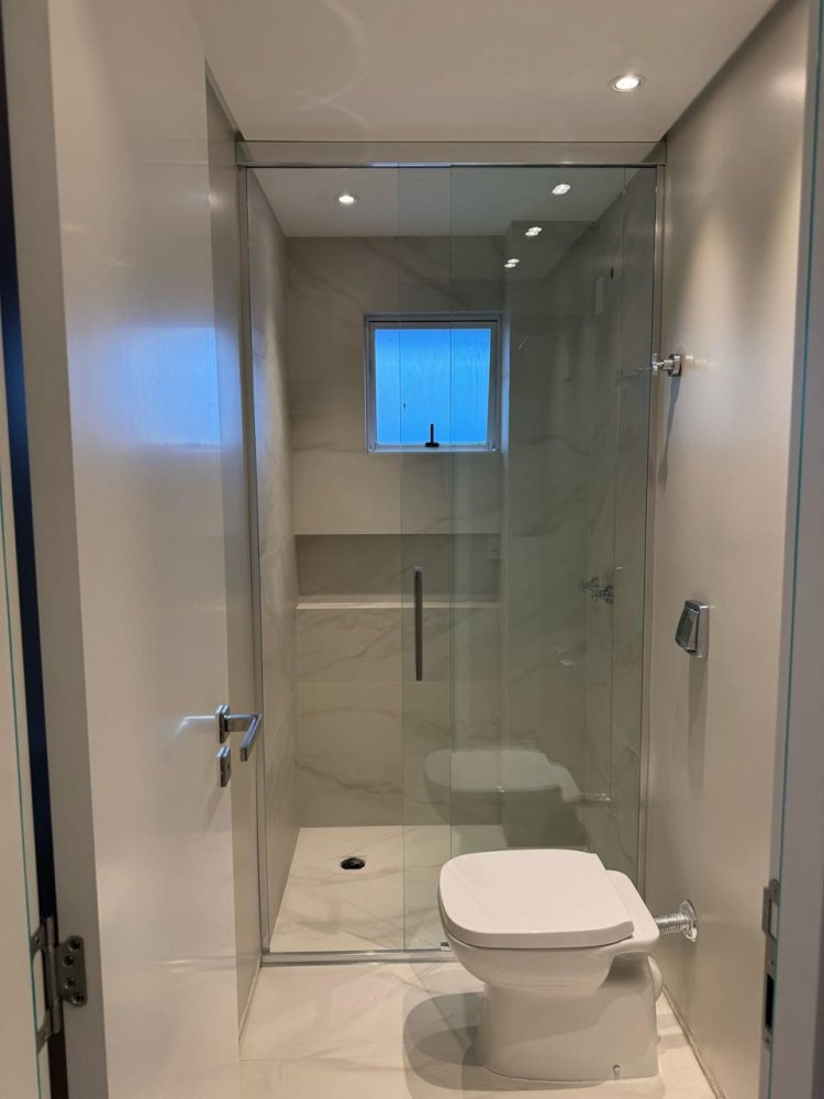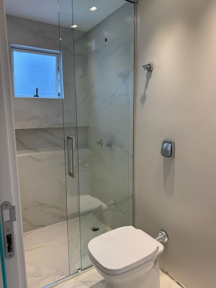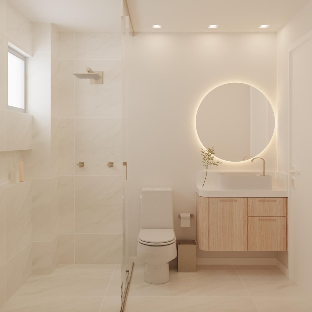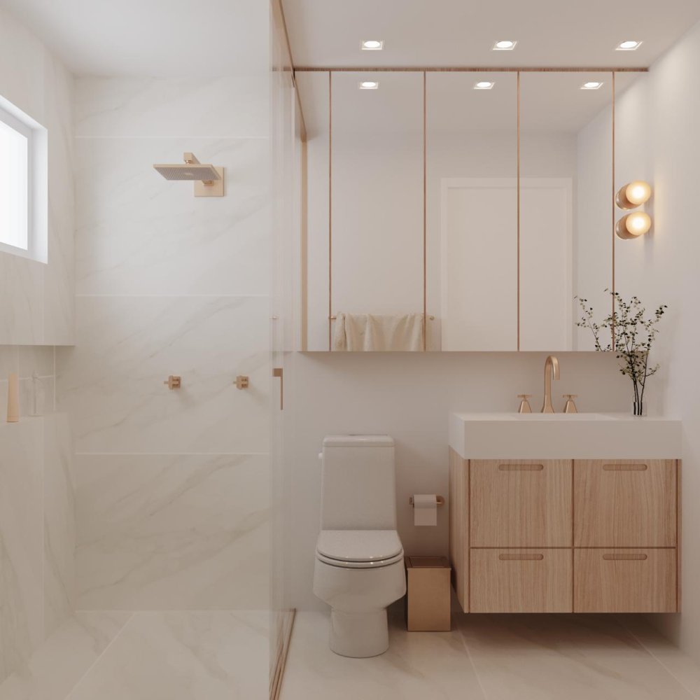 Revestimento marmorizado, box de vidro, nichos embutidos e metais modernos. Design funcional com toque sofisticado.
