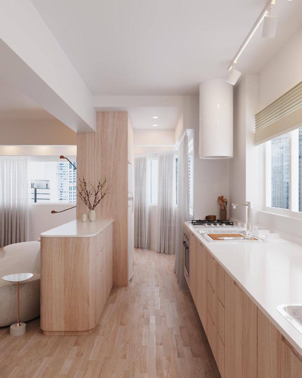 A luz natural invade o ambiente através de janelas amplas, conectando interior e exterior com fluidez. Um convite ao bem-estar diário.