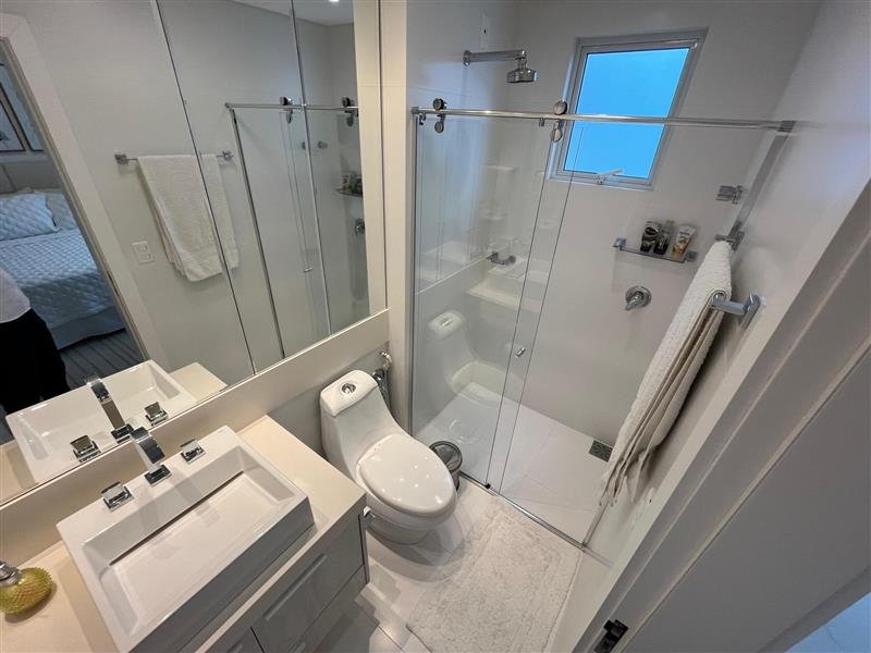 Bancadas amplas, iluminação suave, box em vidro temperado e acabamentos clean entregam sofisticação com praticidade no dia a dia. A suíte máster oferece ainda uma experiência spa com banheira para banhos relaxantes frente ao oceano.