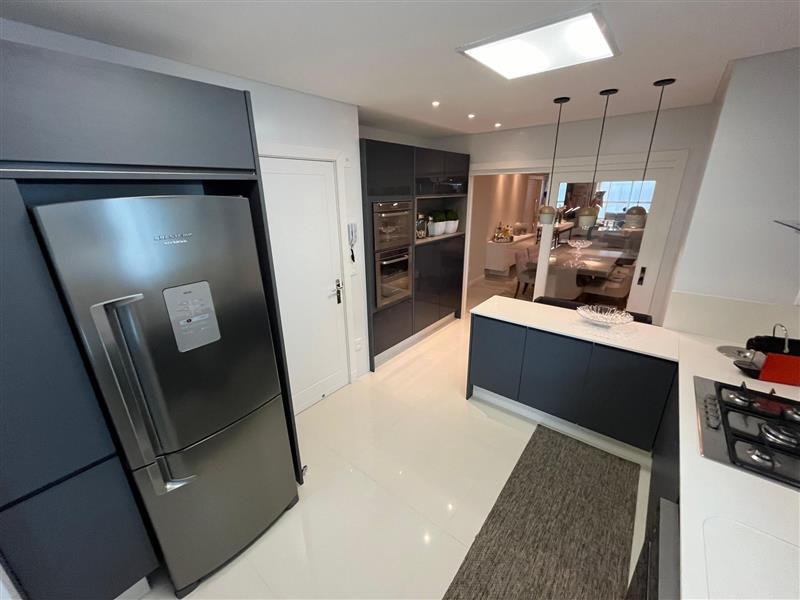 Eletros embutidos, bancada em silestone, marcenaria de alto padrão e circulação fluida tornam a cozinha funcional e bela.