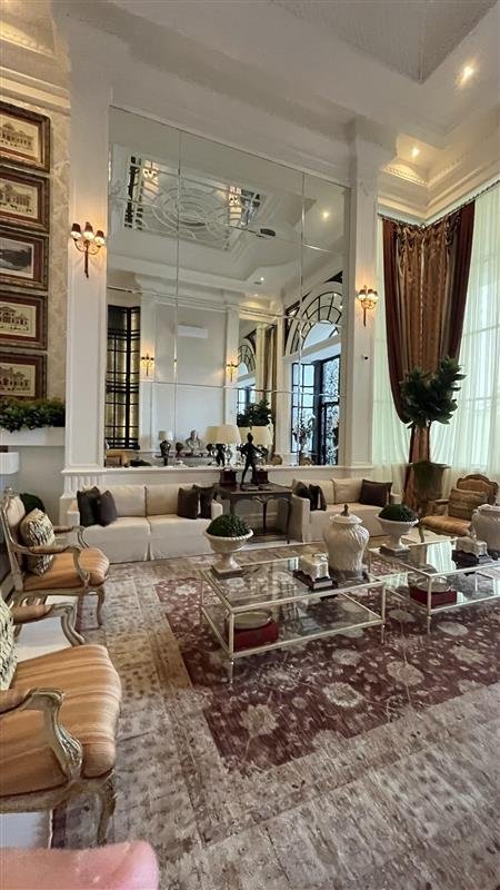 O hall de entrada surpreende com pé-direito duplo, cortinas em linho, mobiliário clássico e espelhos decorativos.