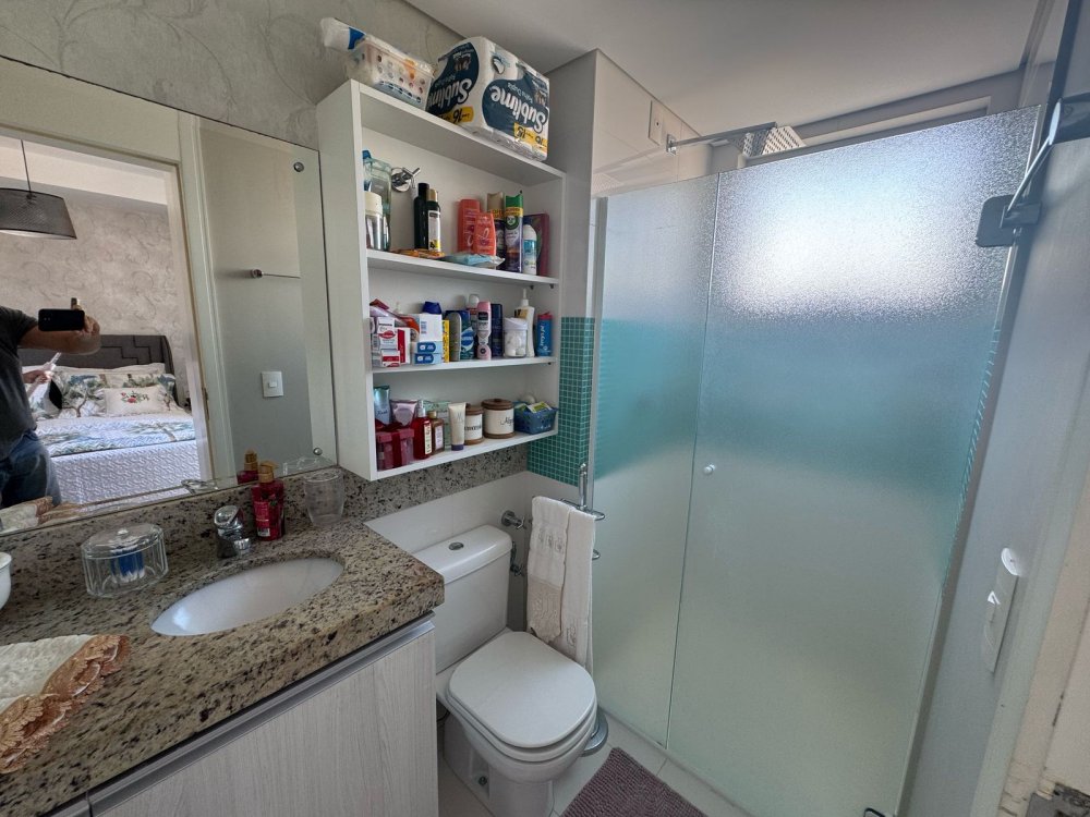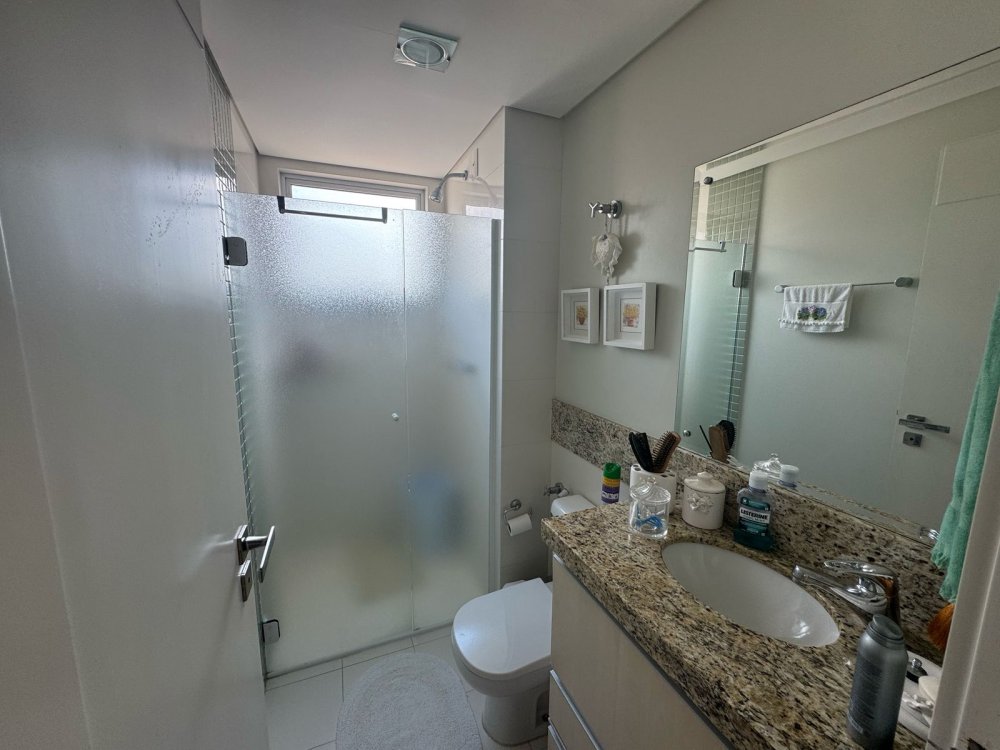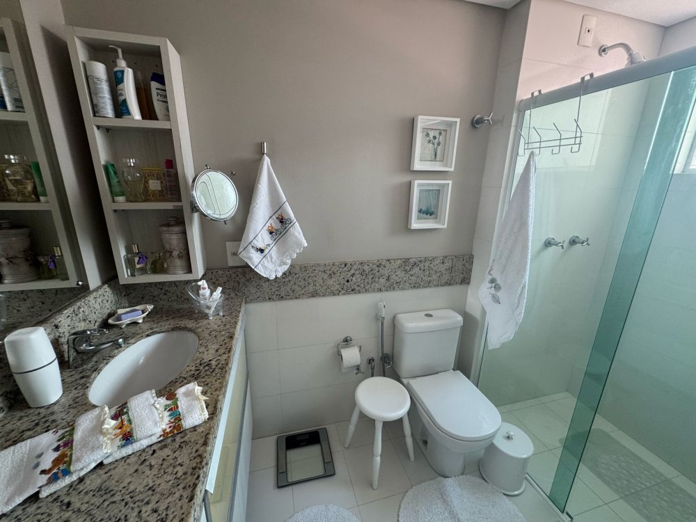- Banheiro da suíte com box de vidro, espelho amplo e bancada em granito