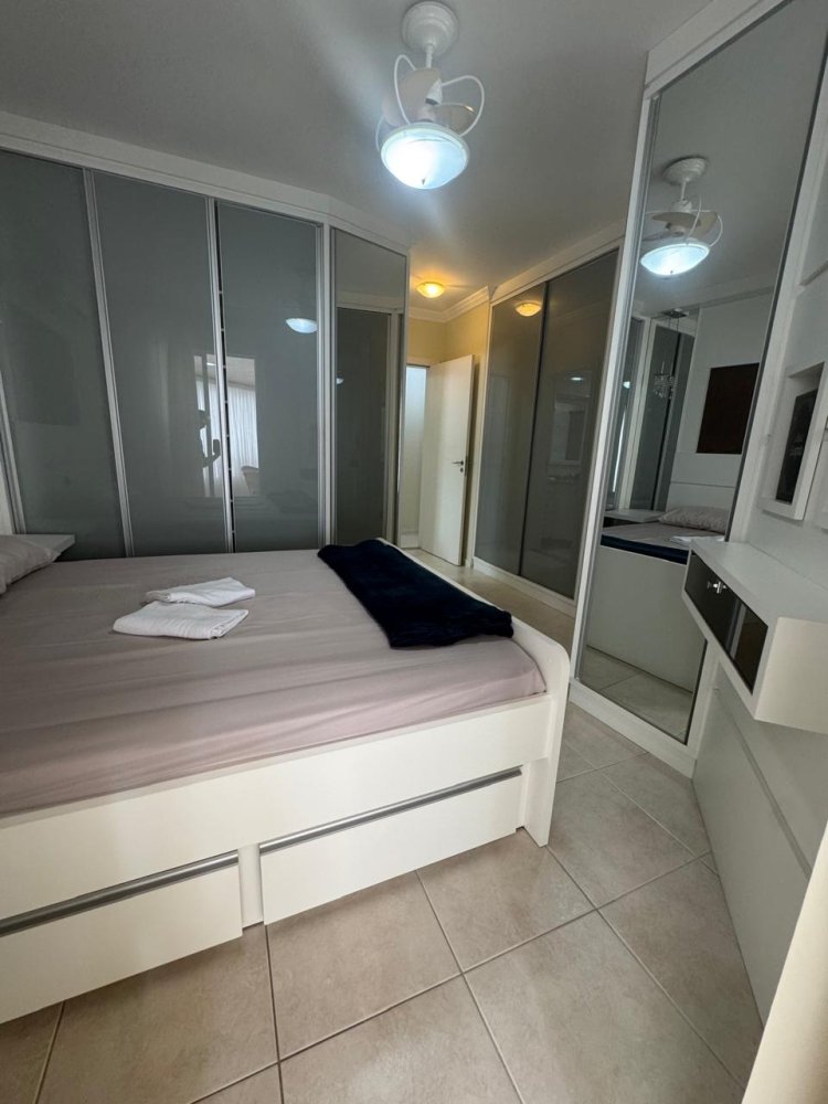 A suíte principal transmite conforto e elegância. Os armários com portas espelhadas aumentam a luminosidade e conferem amplitude ao ambiente. A cama com gavetas reforça o aproveitamento inteligente do espaço. Detalhes como o painel decorativo e o ar-condicionado garantem uma experiência completa de bem-estar.