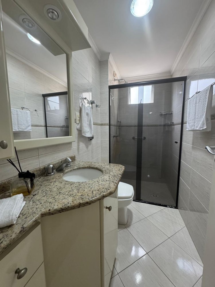 Banheiro da suíte com acabamento em porcelanato claro e bancada em granito. A iluminação natural vinda da janela complementa o box de vidro temperado e o armário planejado. Um espaço funcional e elegante, ideal para a rotina com conforto.