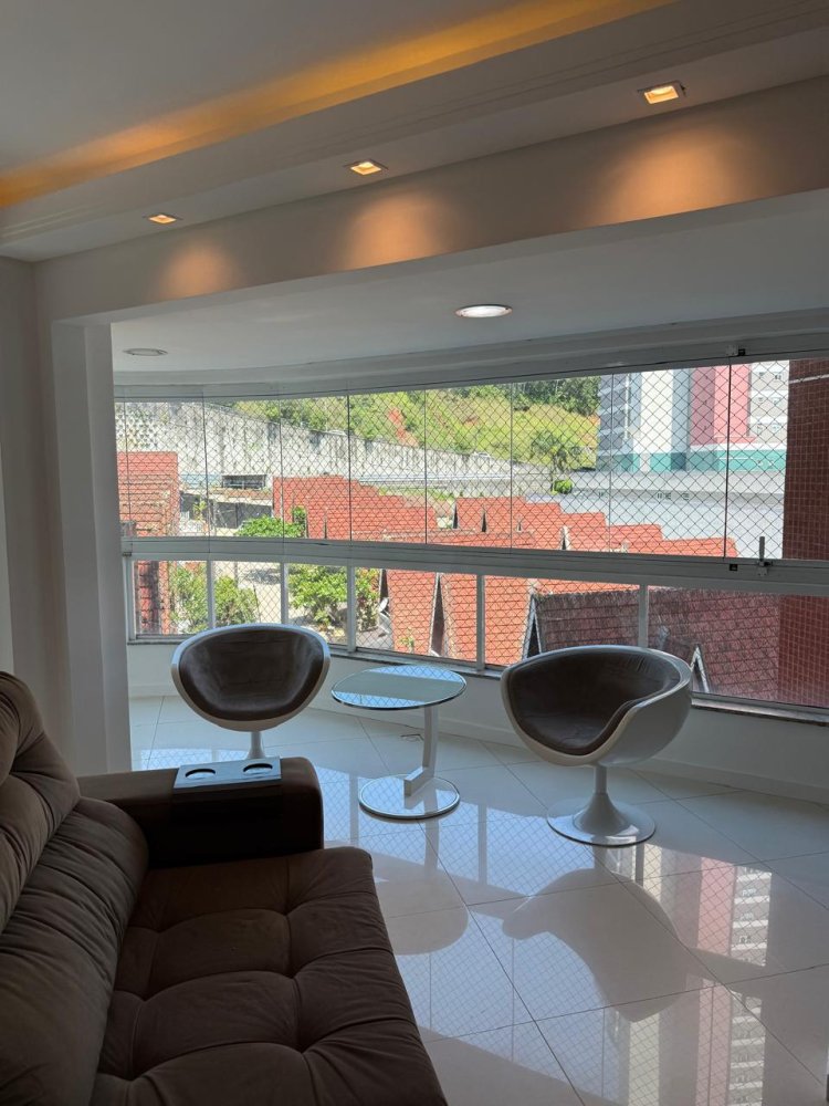 Fechada com vidro e voltada para o nascer do sol, essa varanda é um refúgio para os momentos de pausa. Duas poltronas modernas e uma mesinha de apoio criam o cenário perfeito para um café contemplativo ou um fim de tarde leve. A vista panorâmica e a ventilação natural fazem desse espaço um dos grandes diferenciais do imóvel.