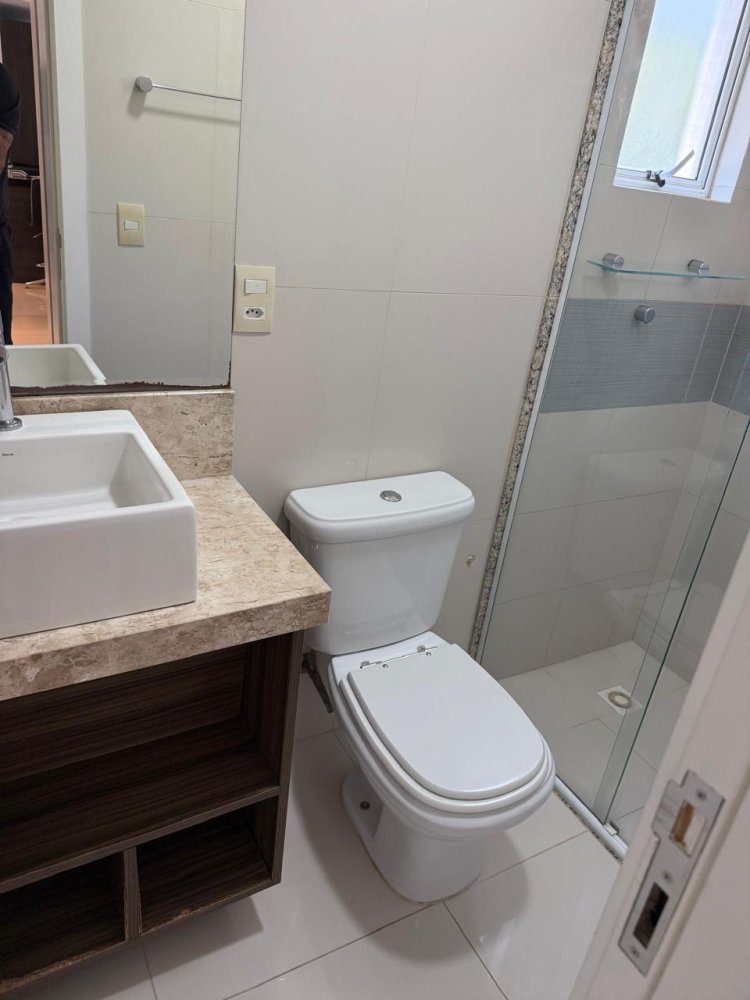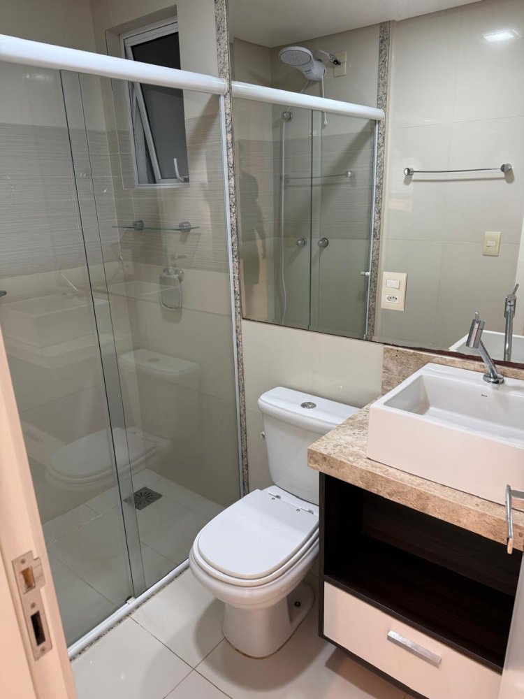 Os 2 banheiros foram projetados para oferecer praticidade sem abrir mão do requinte. Ambos contam com bancadas em mármore travertino, cuba de apoio e box em vidro temperado, com revestimentos neutros e espelhos generosos que ampliam o ambiente.