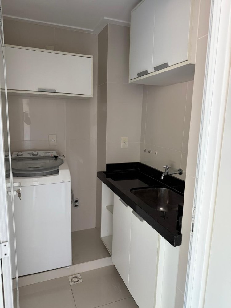 A lavanderia foi inteligentemente planejada: bancada em granito, armários aéreos e espaço para máquina de lavar garantem organização no dia a dia, sem abrir mão da estética.