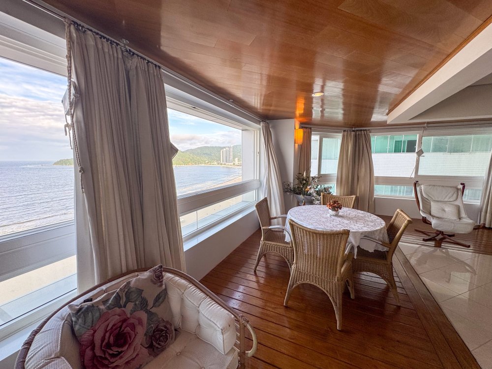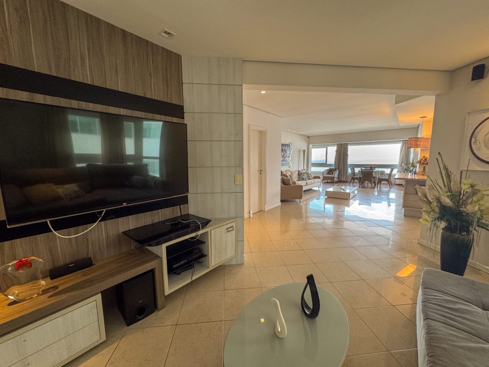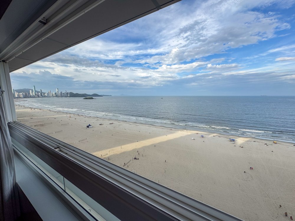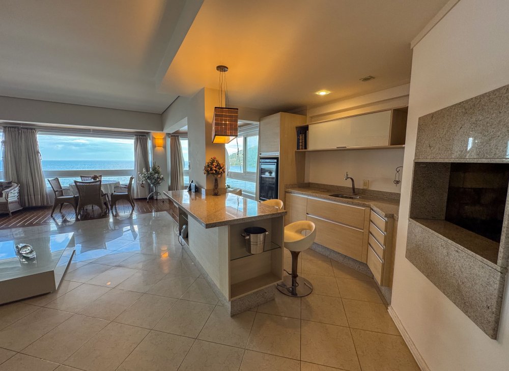 Vista panorâmica definitiva para o mar, sacada gourmet com churrasqueira, 3 suítes, móveis planejados, 214,5 m² privativos e 3 vagas de garagem.