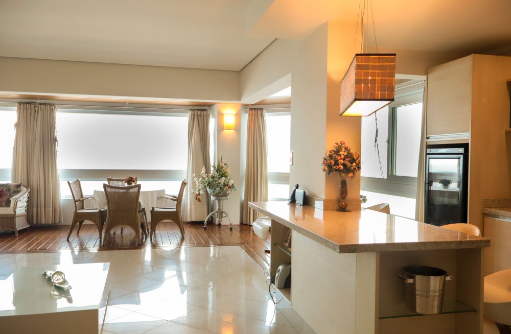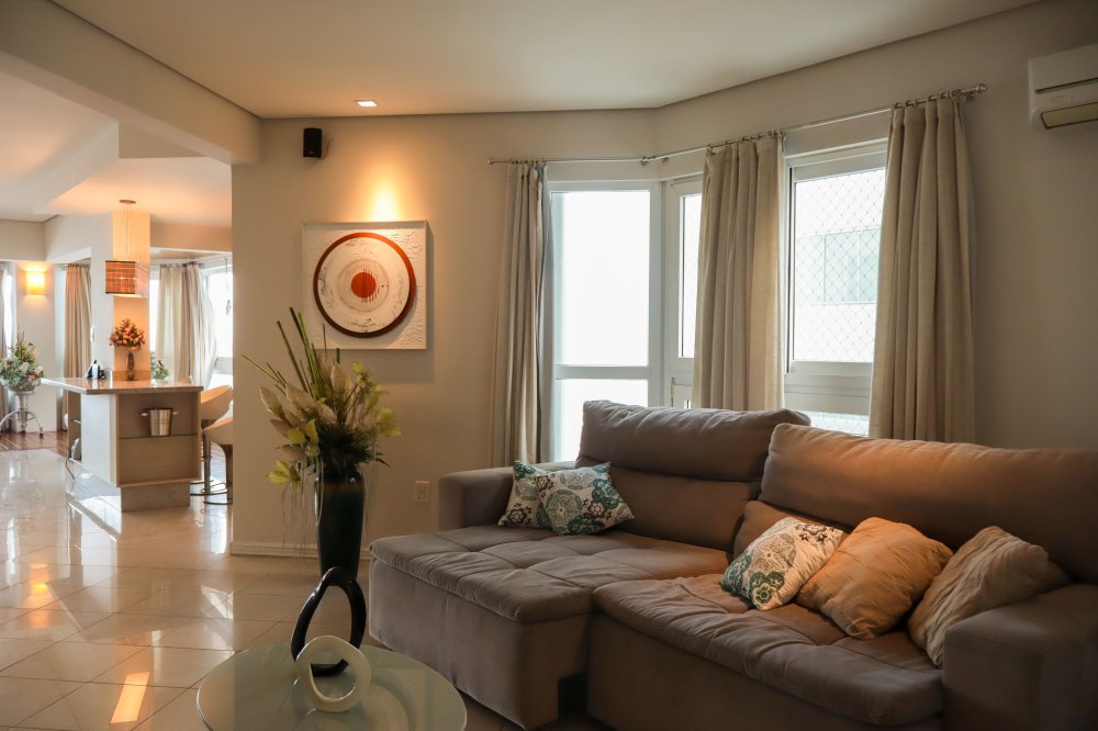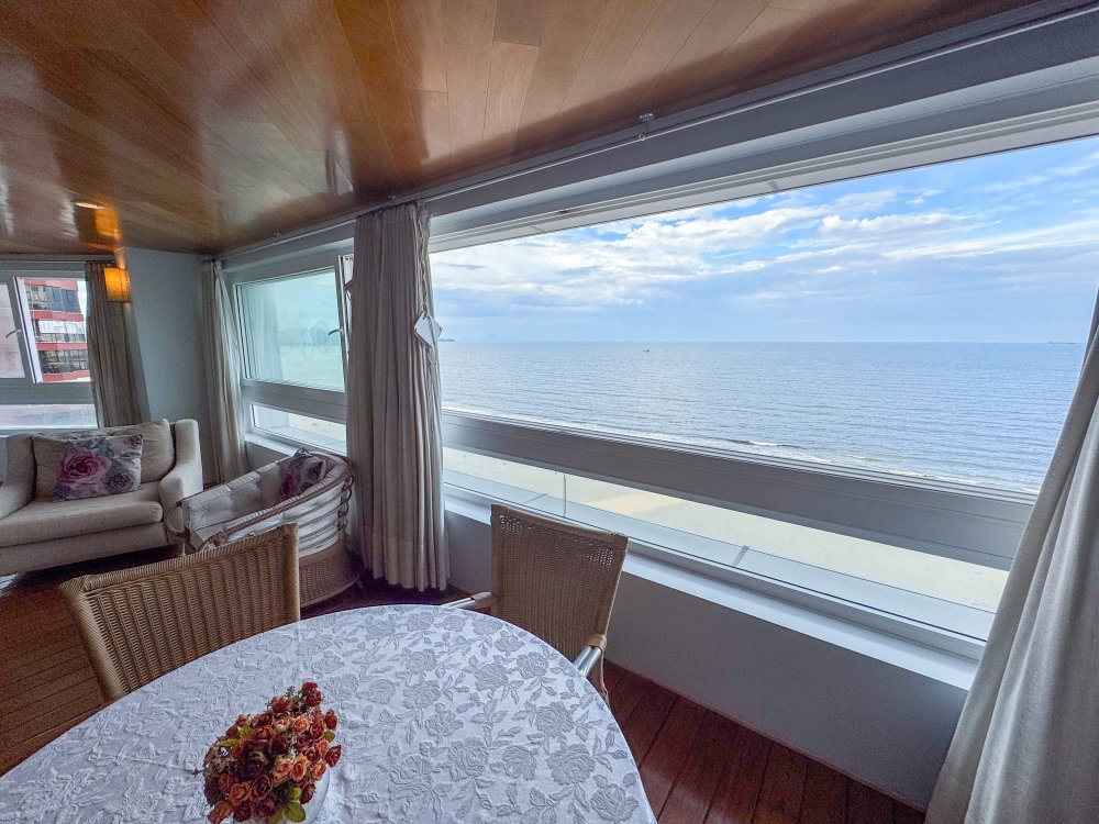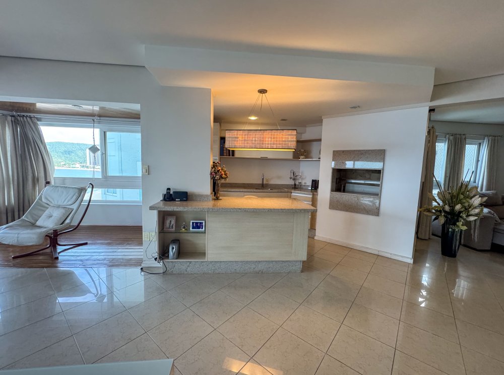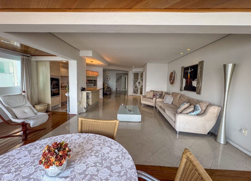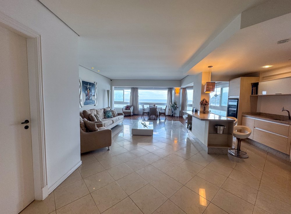 A sacada integrada e envidraçada, com janelões que emolduram o azul do mar, transforma o espaço em um verdadeiro ambiente de contemplação. O piso em madeira ripada aquece o visual e contrasta com a luminosidade natural que invade o apartamento. Um espaço para relaxar, receber e viver com plenitude.