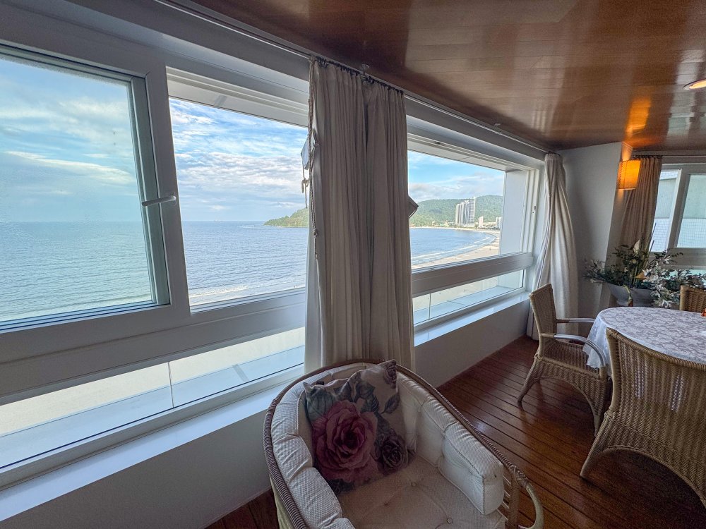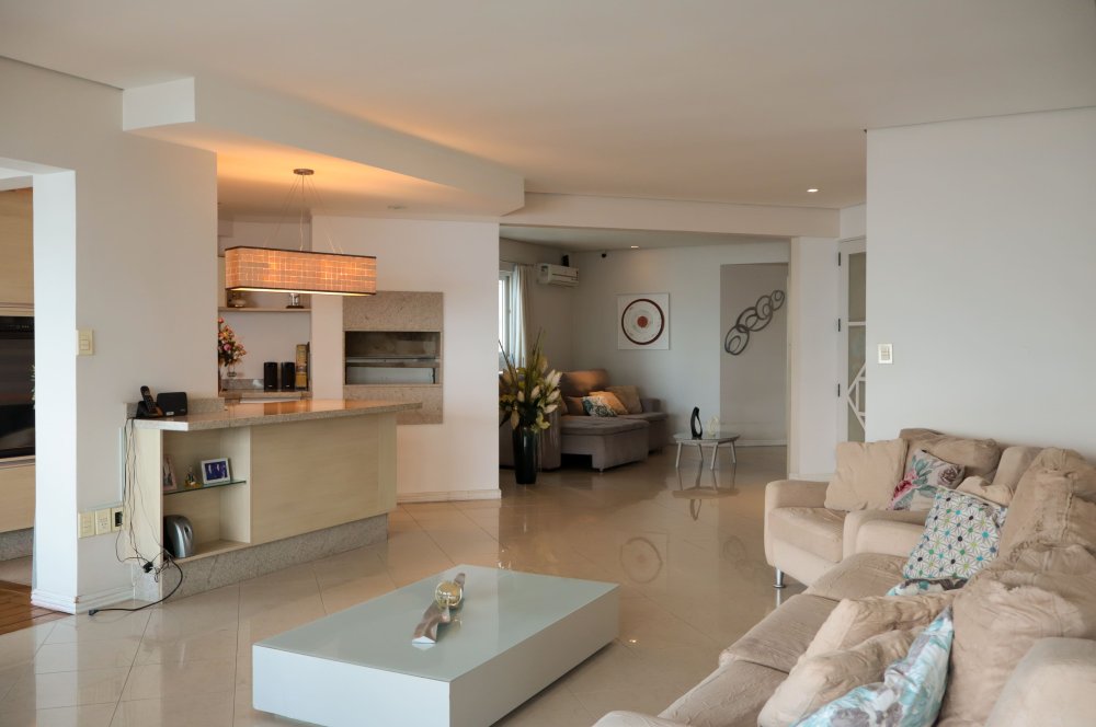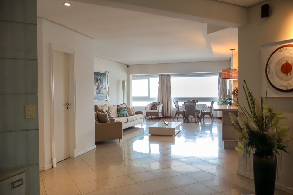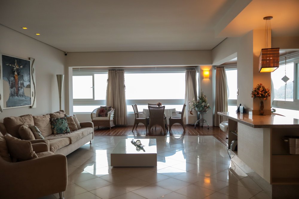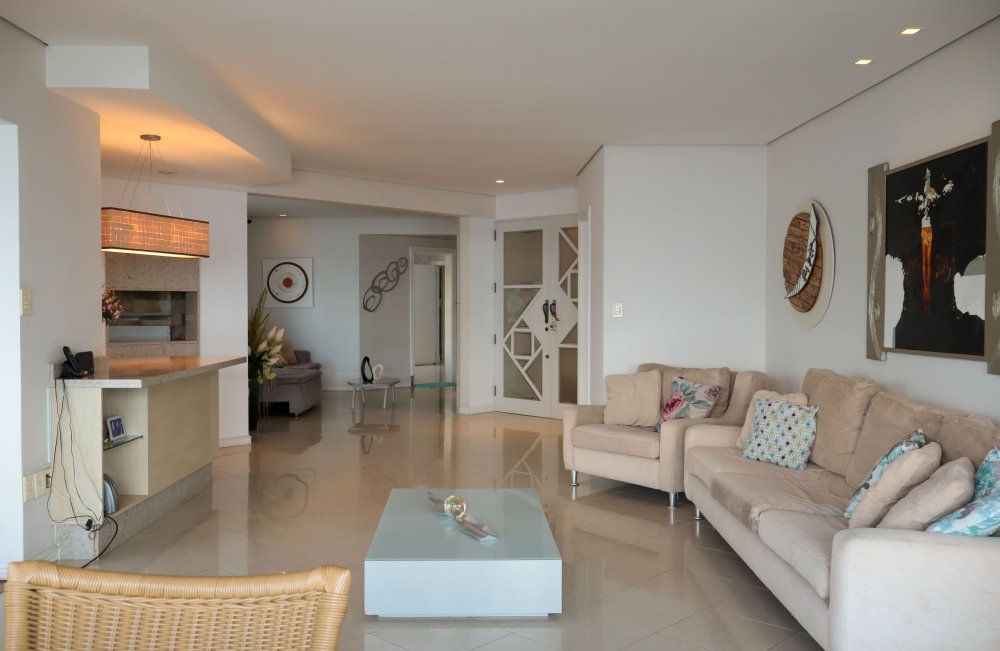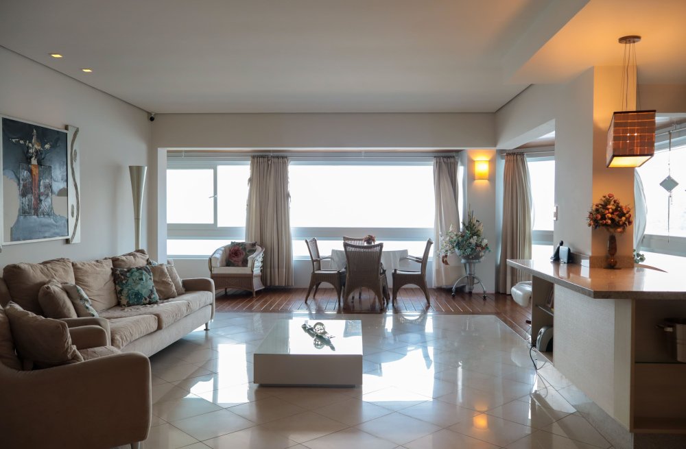 A sacada integrada e envidraçada, com janelões que emolduram o azul do mar, transforma o espaço em um verdadeiro ambiente de contemplação. O piso em madeira ripada aquece o visual e contrasta com a luminosidade natural que invade o apartamento. Um espaço para relaxar, receber e viver com plenitude.