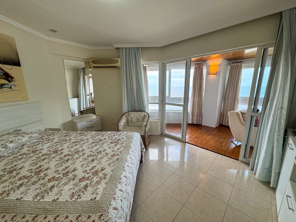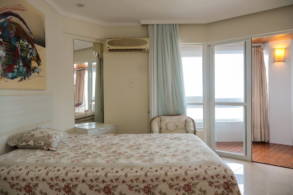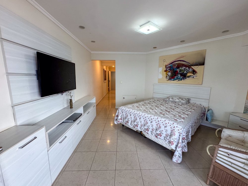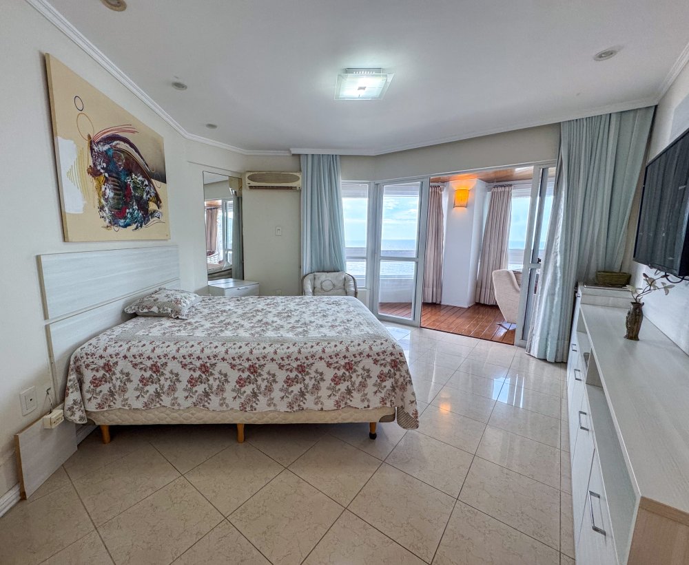 A suíte master é um dos pontos altos do imóvel. Generosa em espaço, conecta-se à sacada com vista frontal para o mar. O ambiente recebe luz natural direta e transmite calma, requinte e exclusividade. O banheiro da suíte acompanha esse padrão, com duas cubas, espelho amplo e layout funcional para a rotina a dois.