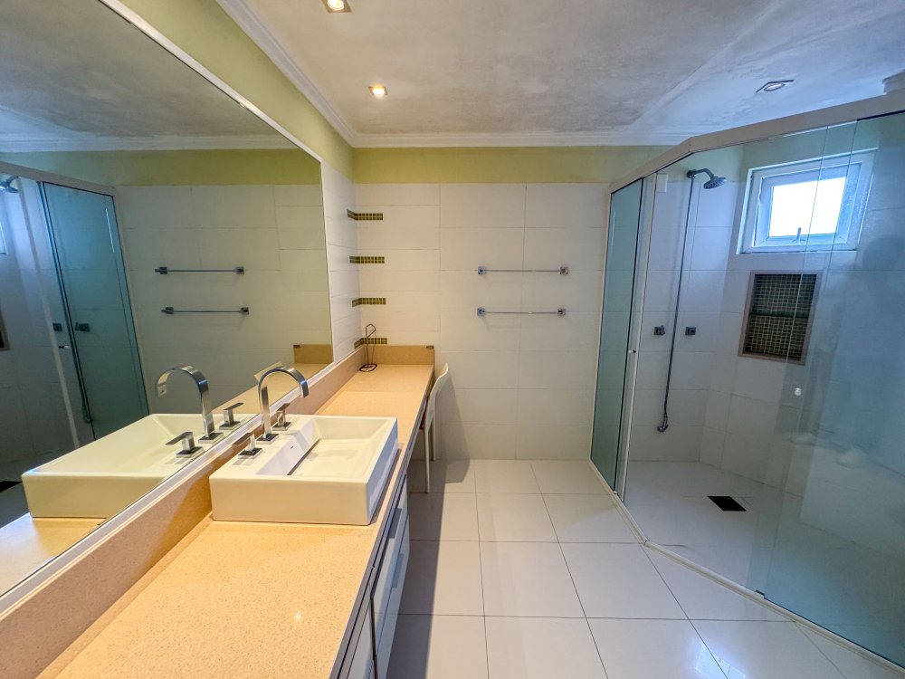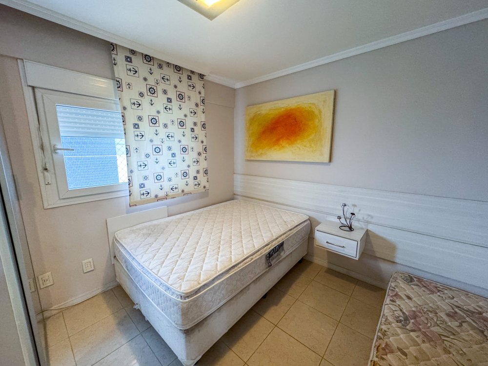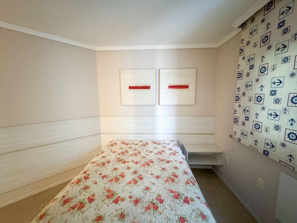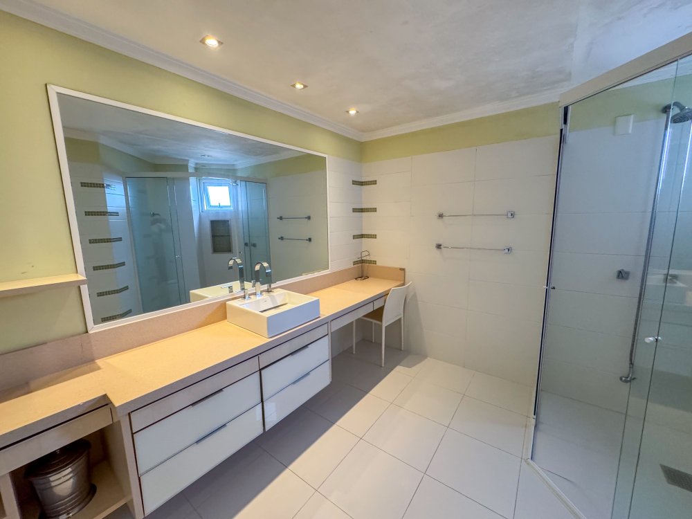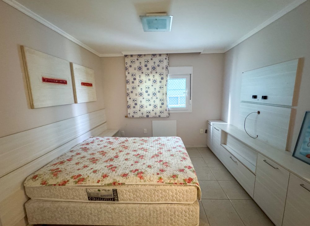 A suíte master é um dos pontos altos do imóvel. Generosa em espaço, conecta-se à sacada com vista frontal para o mar. O ambiente recebe luz natural direta e transmite calma, requinte e exclusividade. O banheiro da suíte acompanha esse padrão, com duas cubas, espelho amplo e layout funcional para a rotina a dois.