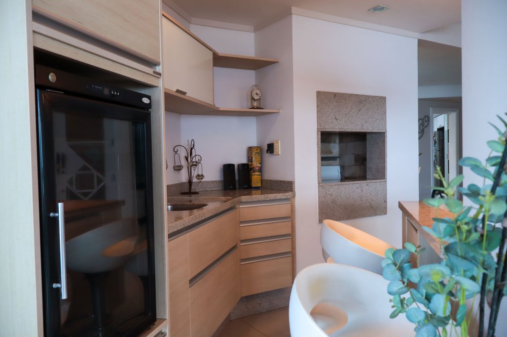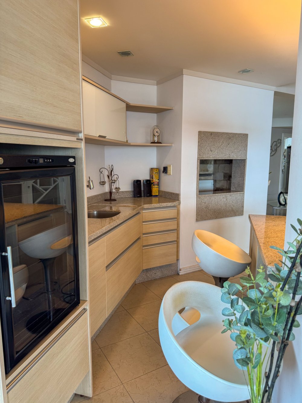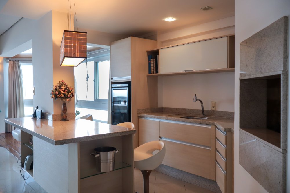 Na cozinha gourmet, a ilha central com banquetas aproxima os convidados da experiência gastronômica. A marcenaria clara, a bancada em granito e a churrasqueira embutida completam o cenário perfeito para almoços em família e jantares descontraídos.