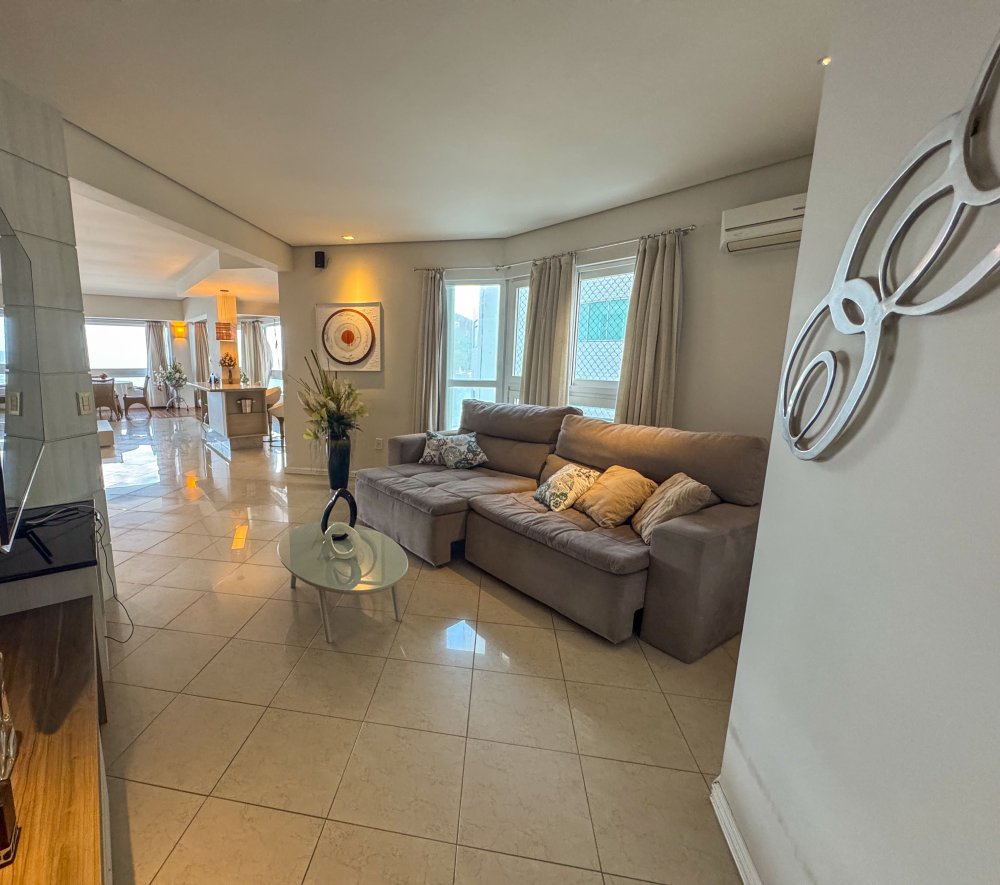 A sala de estar ampla e conectada à varanda foi projetada para momentos de convívio com elegância. A decoração neutra, o porcelanato claro e os acabamentos de alto padrão ampliam a sensação de conforto e leveza. Aqui, cada encontro se torna memorável, com o mar como pano de fundo.