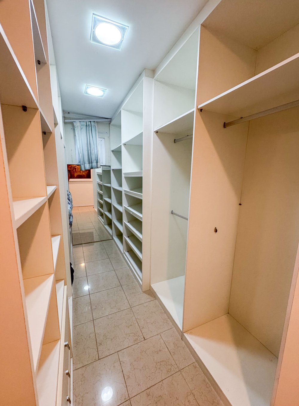O closet tipo corredor, com prateleiras e nichos bem distribuídos, proporciona praticidade sem abrir mão da estética. Tudo à mão, com ordem e leveza visual.