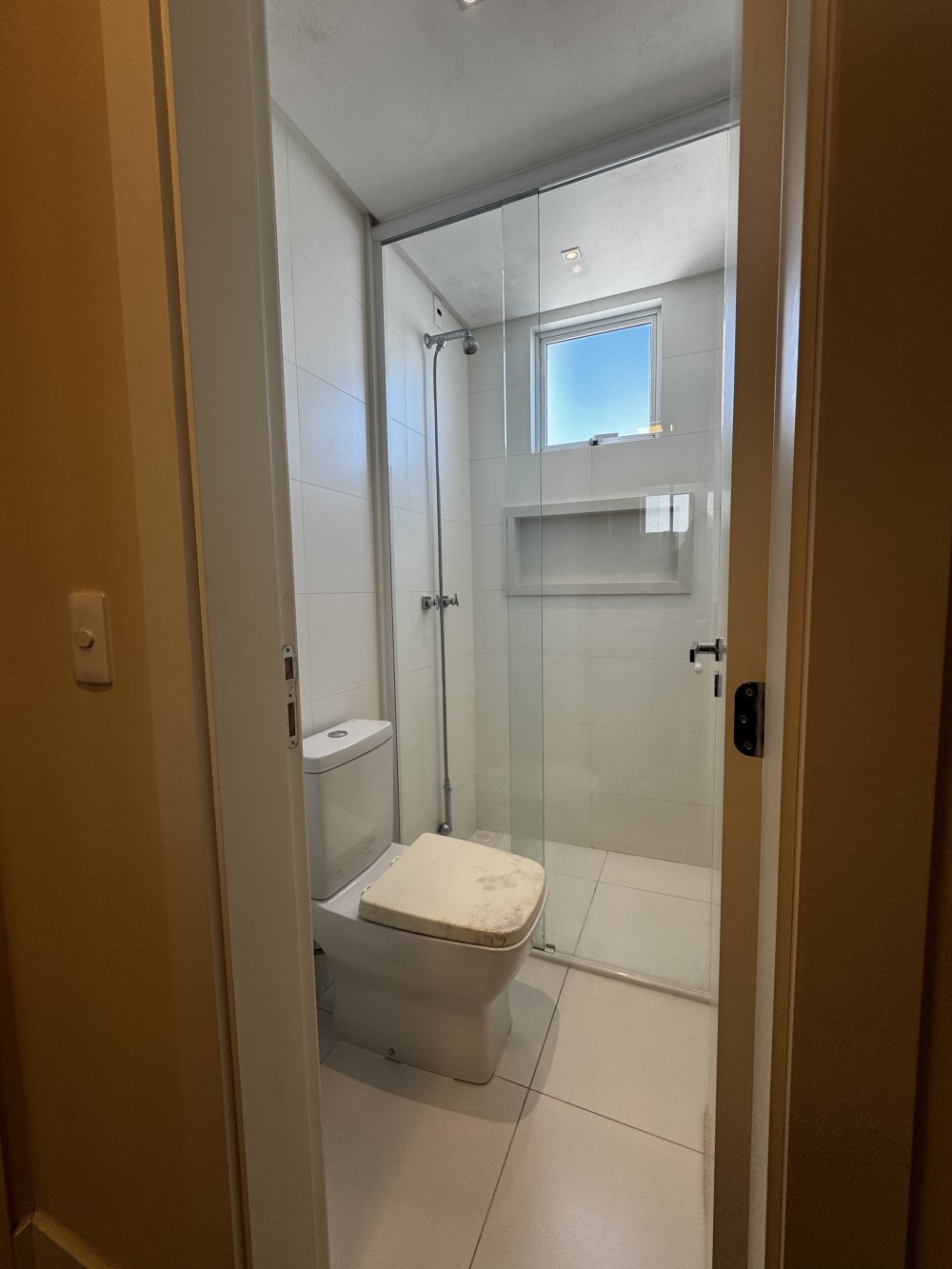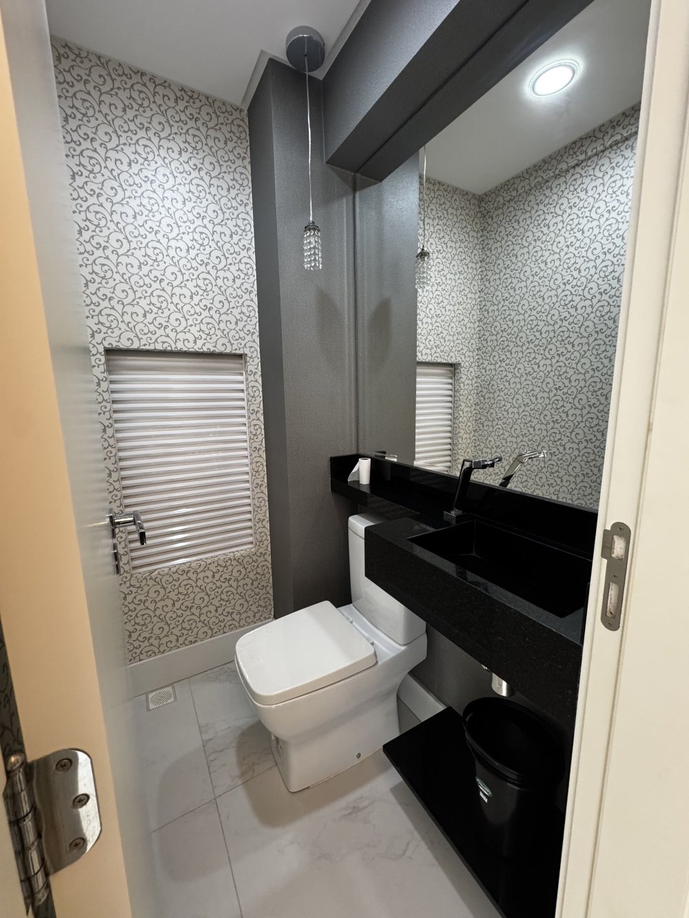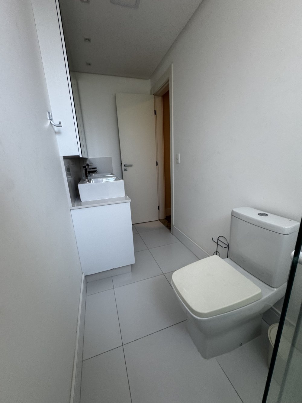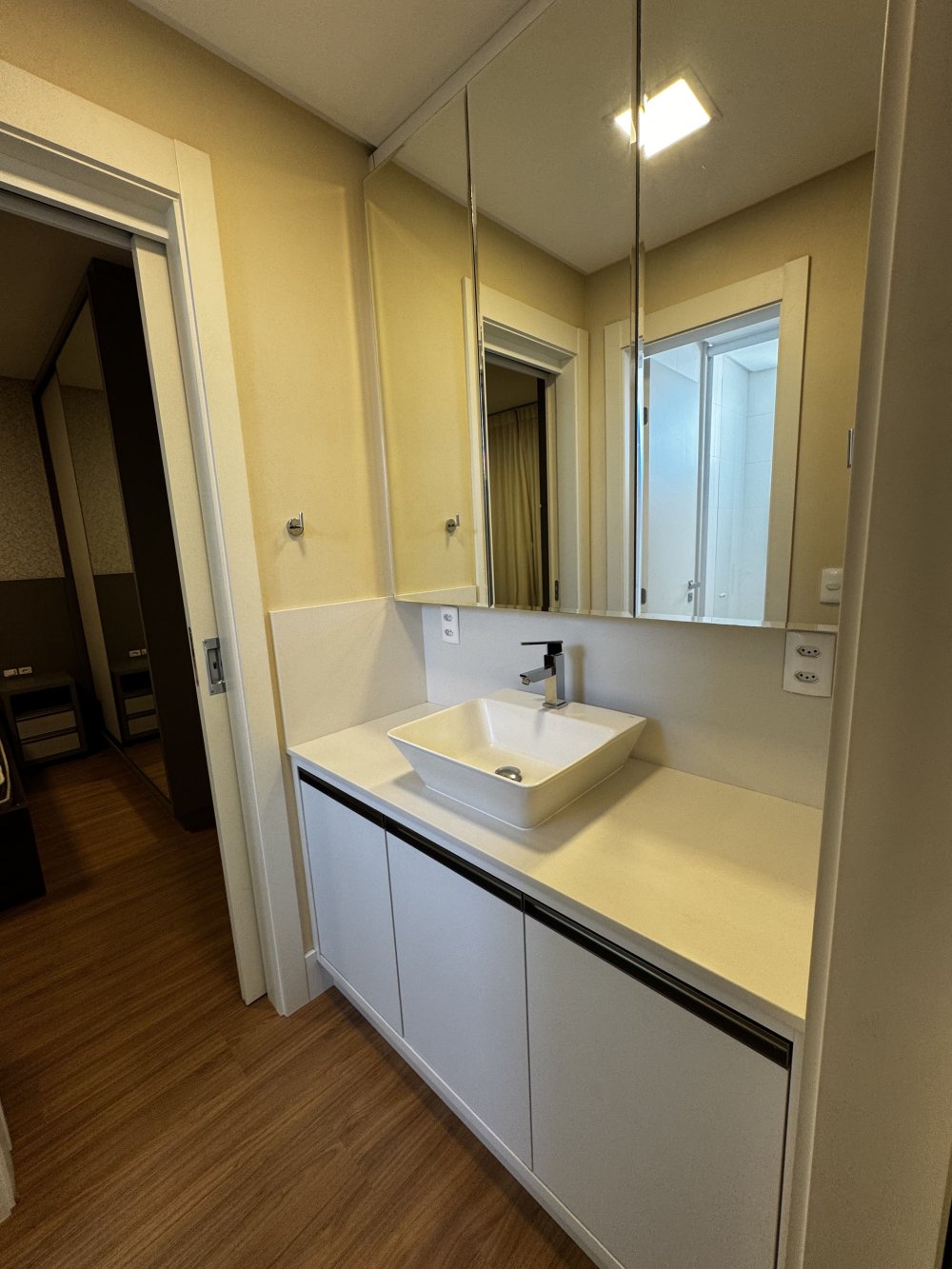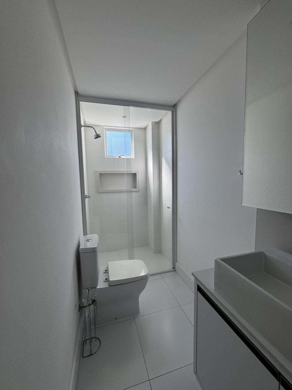O banheiro da suíte acompanha o estilo refinado do dormitório, com bancada em mármore, cuba sobreposta, armários planejados e nicho embutido no box. Todos os 4 banheiros do imóvel, contam com ventilação natural e acabamentos modernos que priorizam funcionalidade e bom gosto.