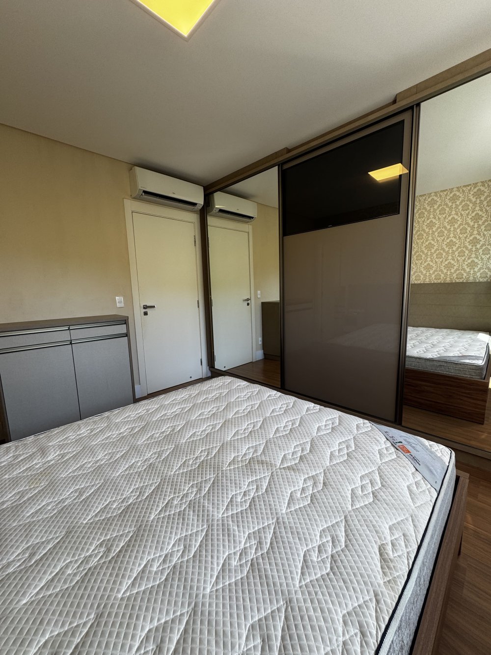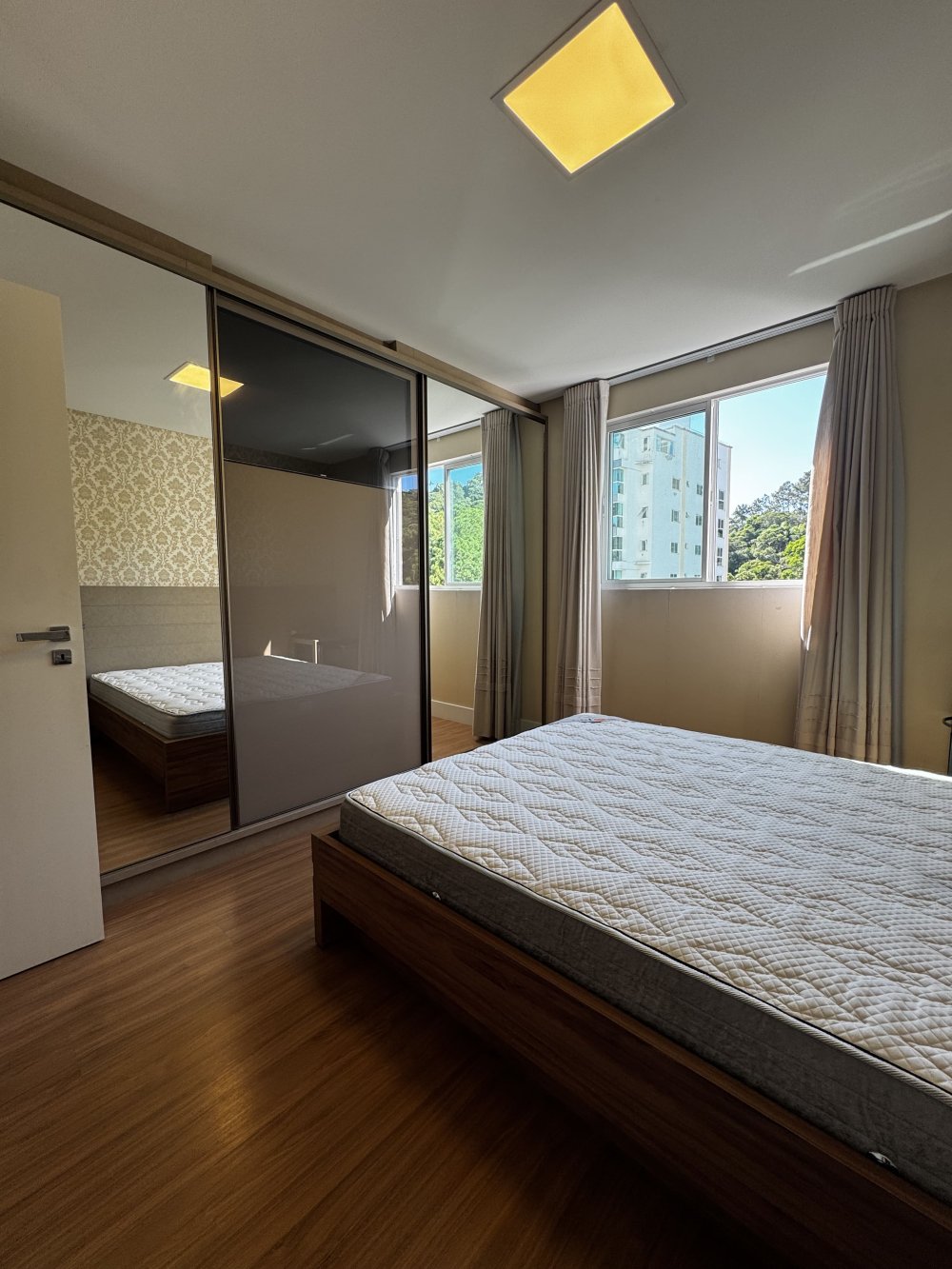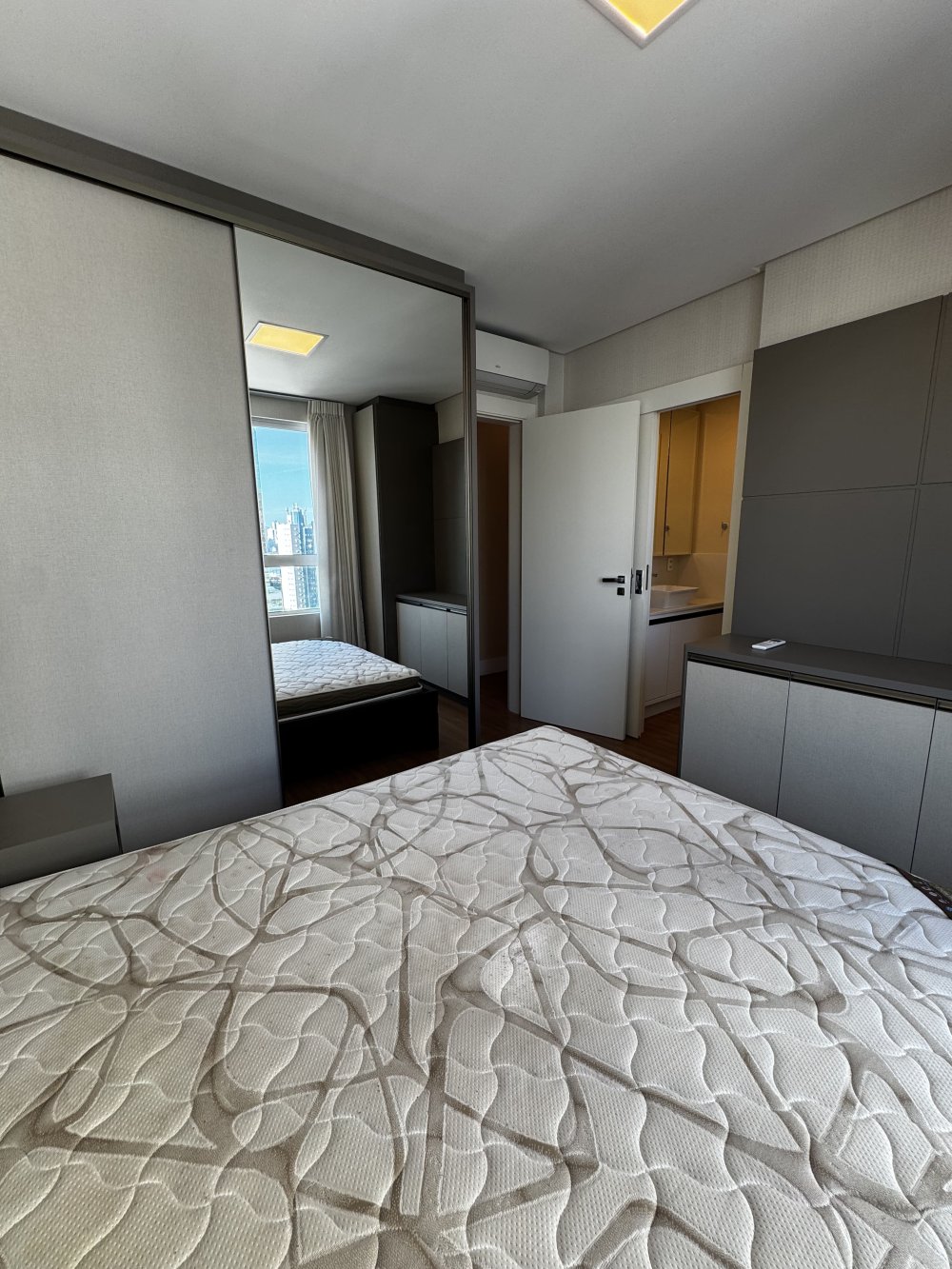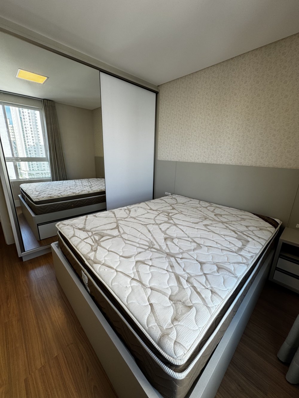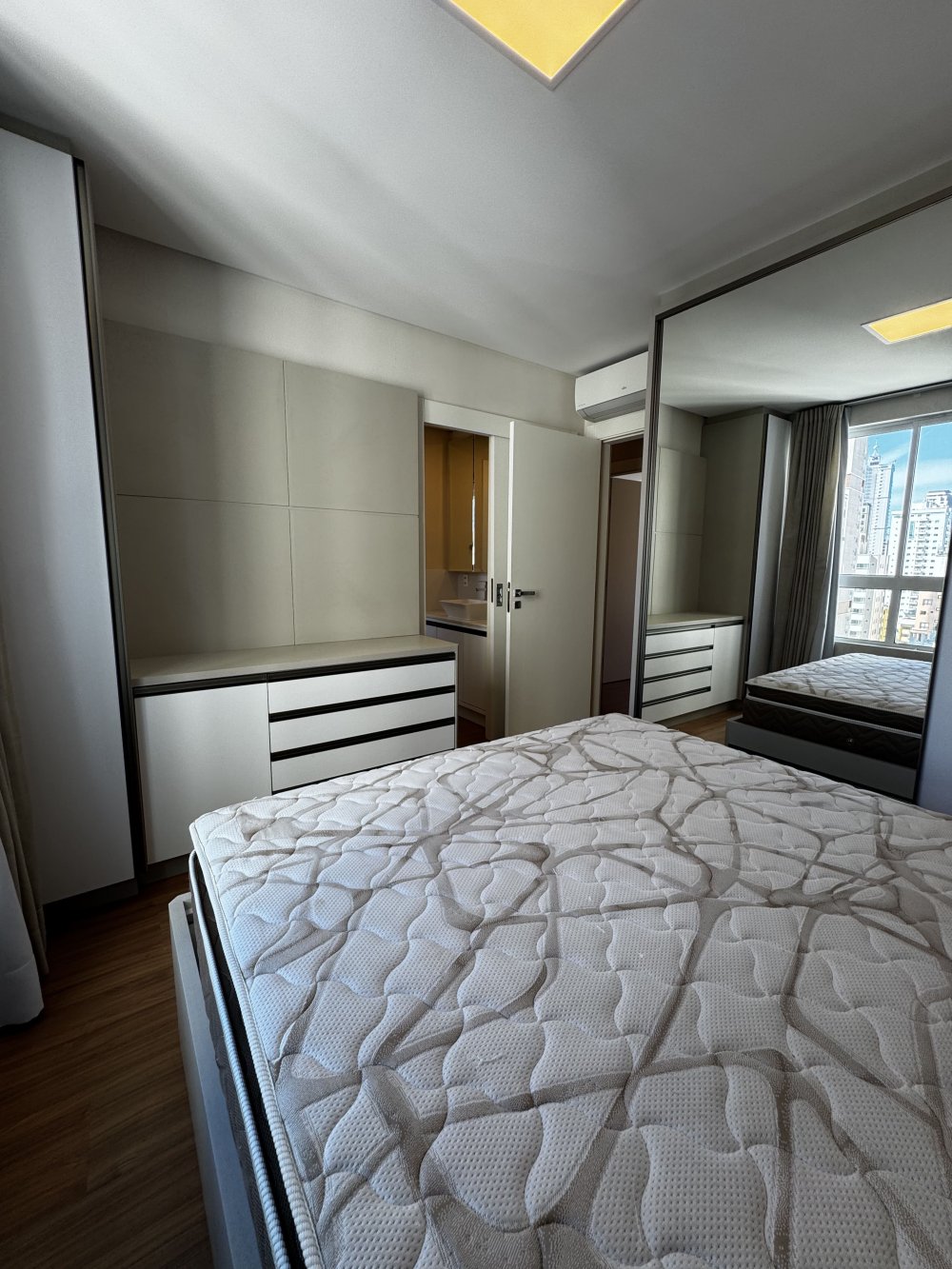 Outro dormitório traz vista urbana e atmosfera contemporânea. Equipado com cama baú, armário com portas espelhadas e papel de parede suave, é ideal para hóspedes ou filhos. Já o quarto com marcenaria planejada, ar-condicionado e armários embutidos destaca-se pela elegância neutra, pronto para ser personalizado conforme o estilo do morador.