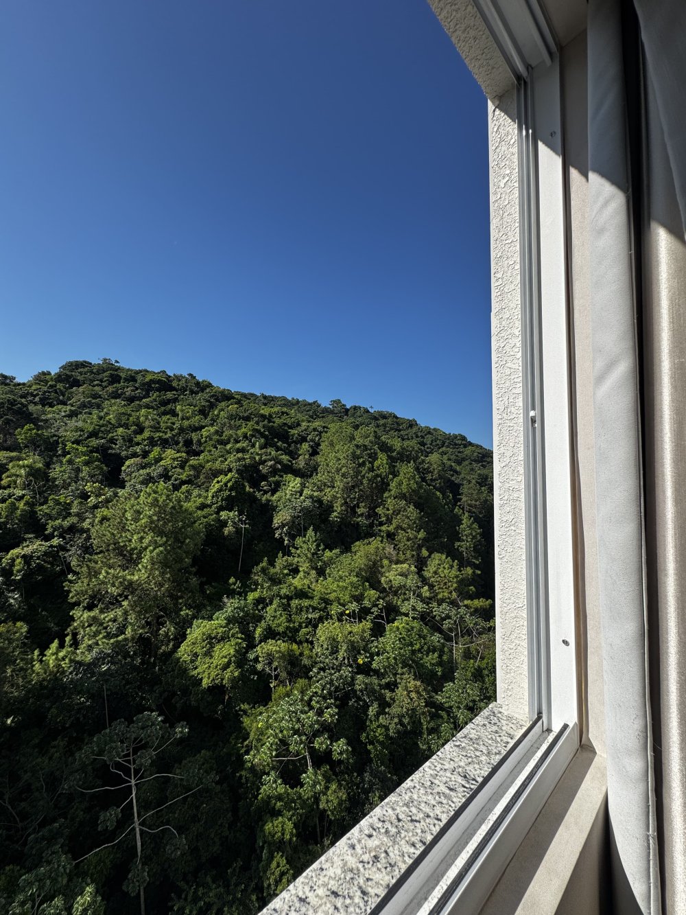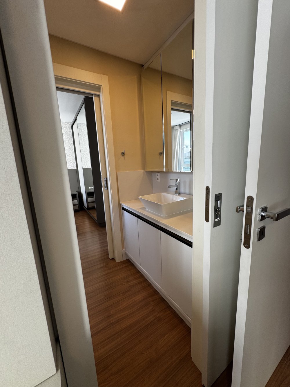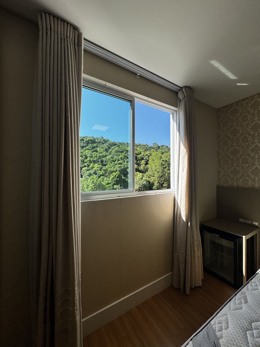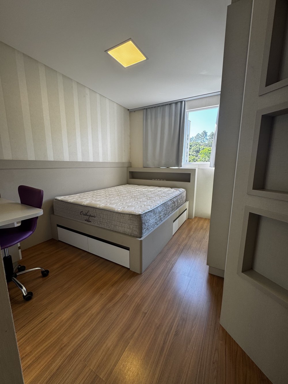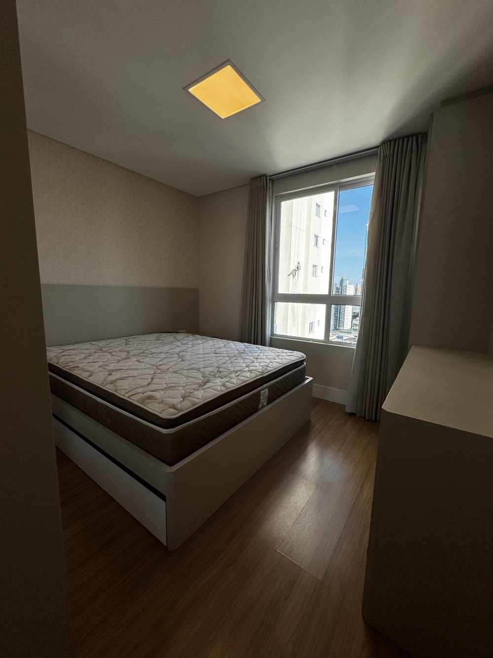 Outro dormitório traz vista urbana e atmosfera contemporânea. Equipado com cama baú, armário com portas espelhadas e papel de parede suave, é ideal para hóspedes ou filhos. Já o quarto com marcenaria planejada, ar-condicionado e armários embutidos destaca-se pela elegância neutra, pronto para ser personalizado conforme o estilo do morador.