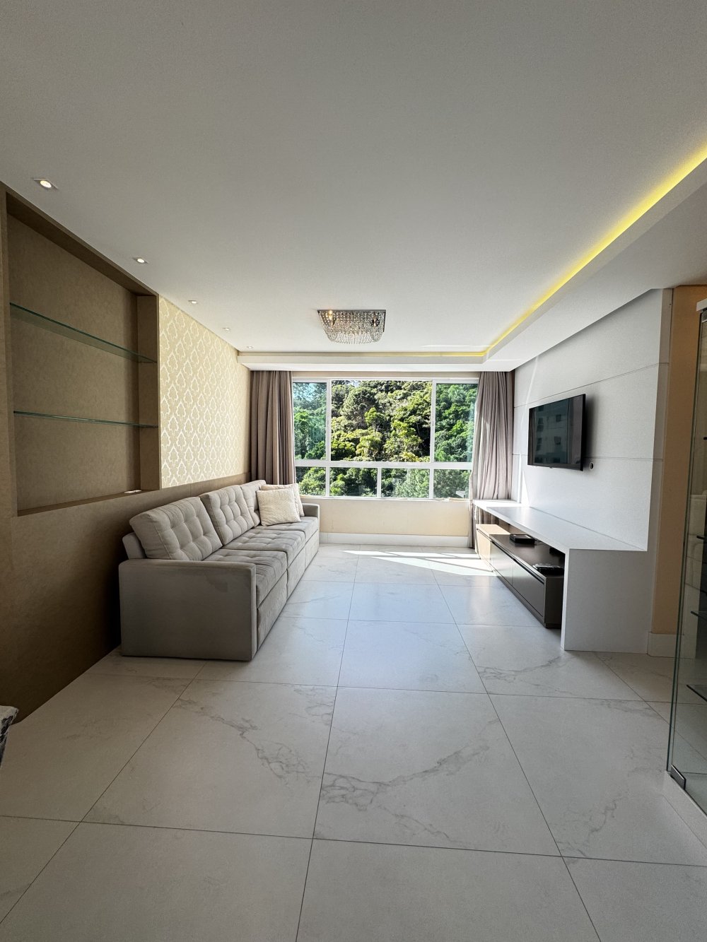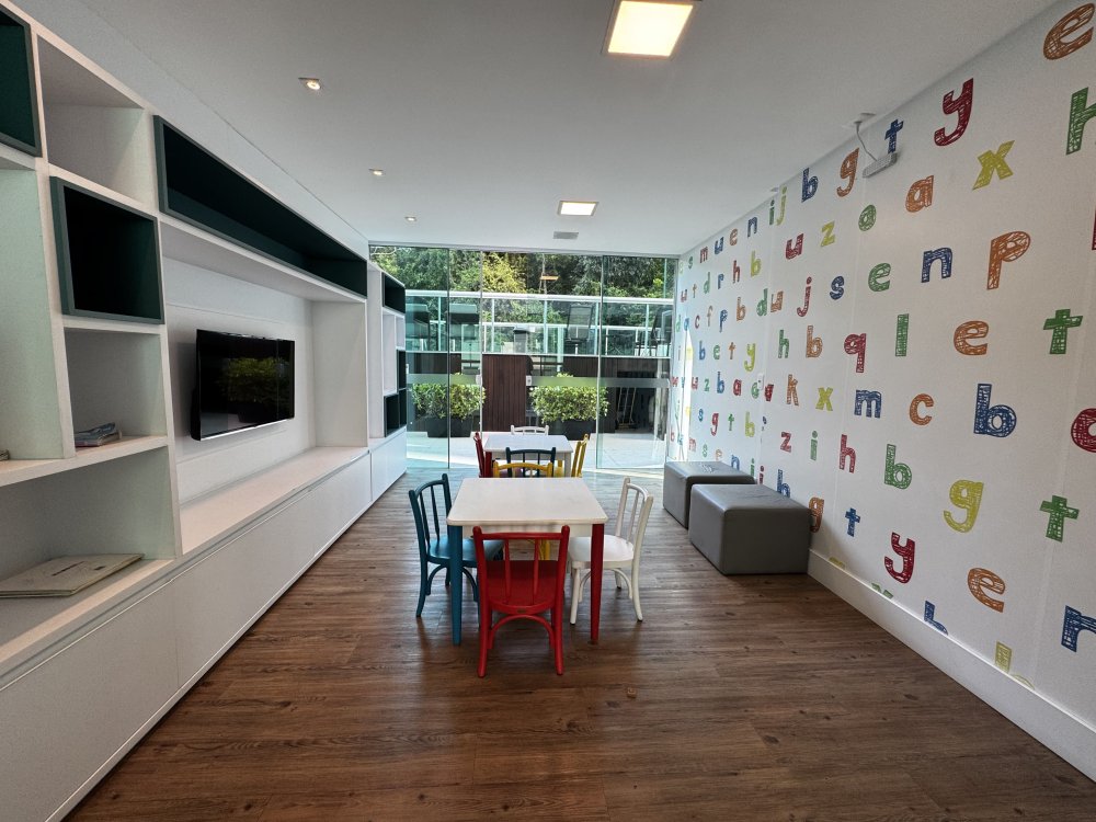 Logo na entrada, o apartamento impressiona pelo amplo living integrado, onde a sala de estar, jantar, jogos e TV se conectam de forma elegante e funcional. O piso em porcelanato marmorizado, aliado ao projeto luminotécnico e ao painel ripado, valoriza cada detalhe do espaço. Janelas amplas permitem que a luz natural preencha o ambiente, que conta ainda com um lustre de cristal como peça de destaque. Um espaço ideal para receber ou relaxar em dias mais tranquilos.