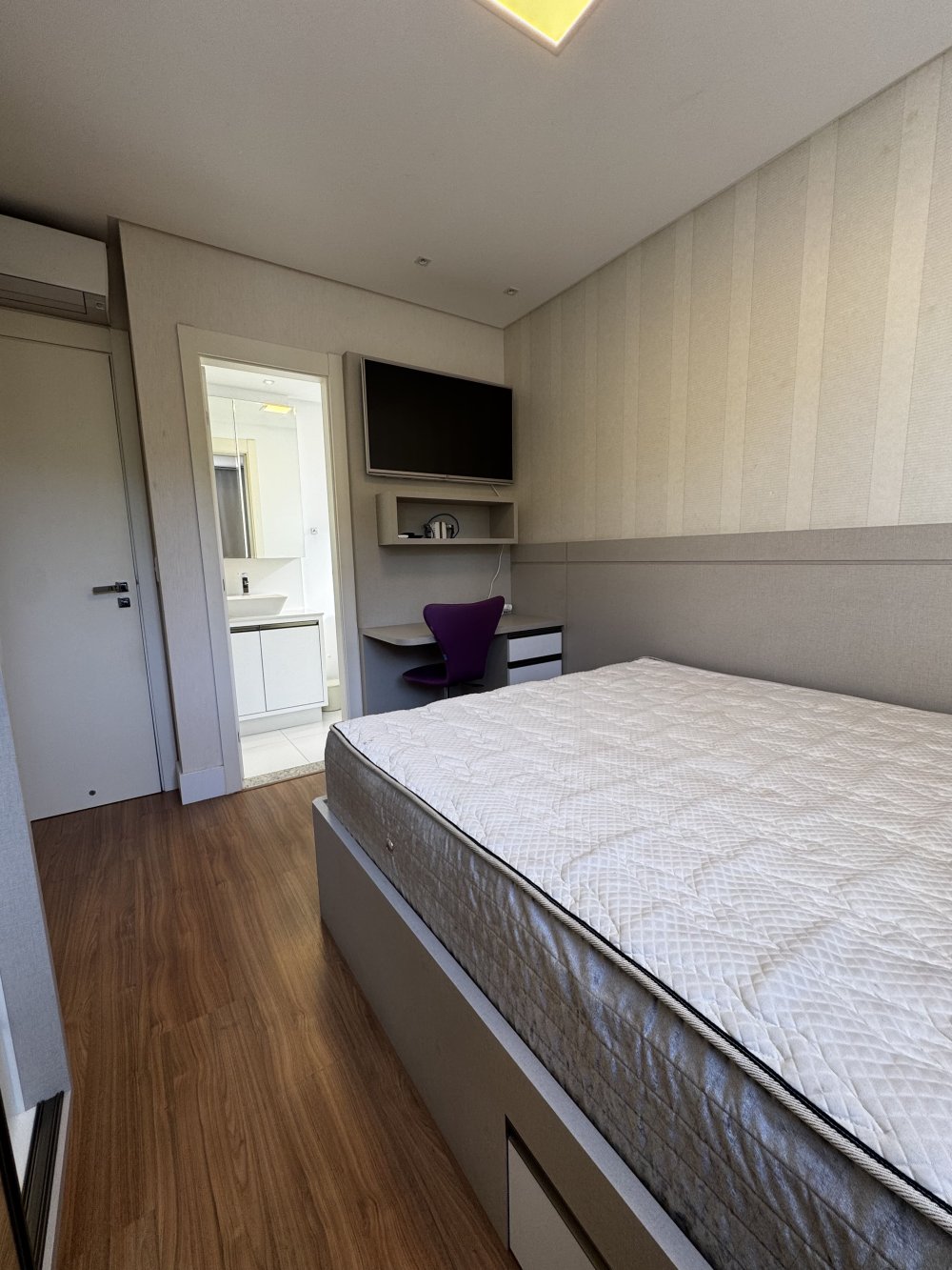 A suíte principal é um convite ao relaxamento. A paleta de tons claros se combina ao papel de parede clássico e à cabeceira estofada, criando uma atmosfera aconchegante. O armário com portas espelhadas, o ar-condicionado e os móveis sob medida reforçam a sofisticação e o aproveitamento de espaço. A vista para a vegetação proporciona serenidade ao despertar.