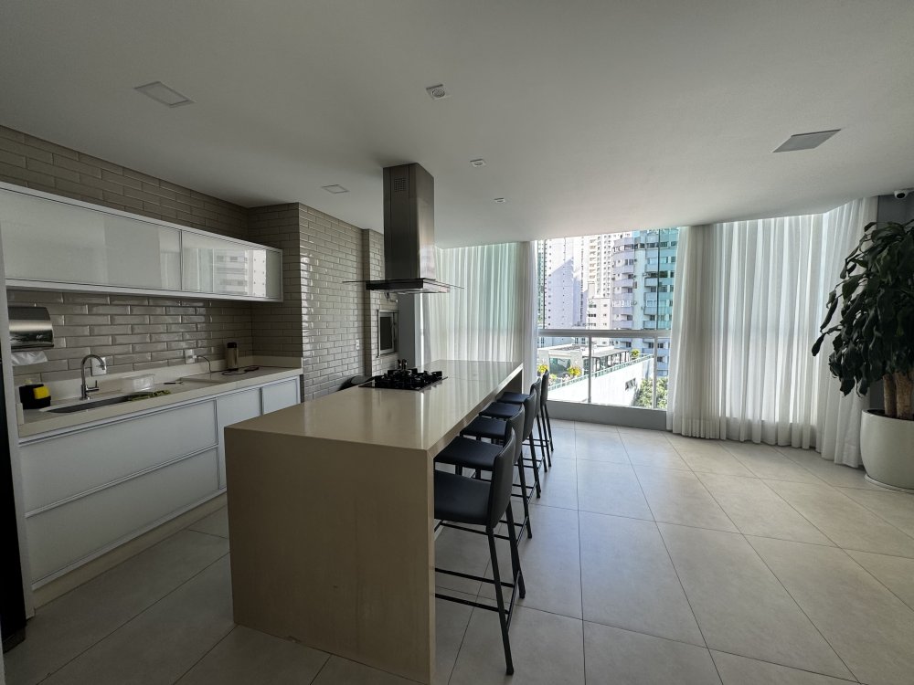 A cozinha é um dos pontos altos do apartamento. Integrada ao living, possui bancada funcional, móveis planejados sob medida e excelente fluxo de circulação. Ao lado, a churrasqueira a carvão amplia as possibilidades de convivência, tornando o espaço perfeito para reunir amigos e familiares.