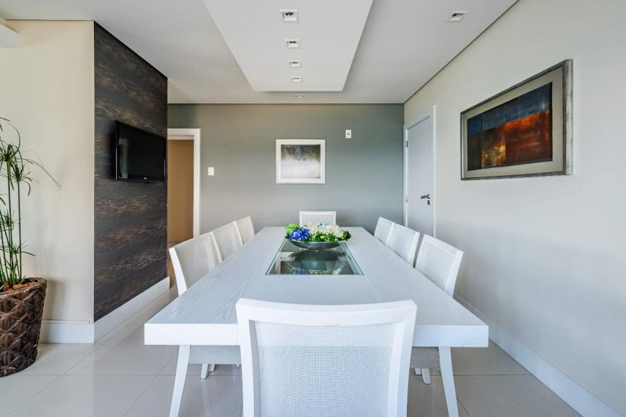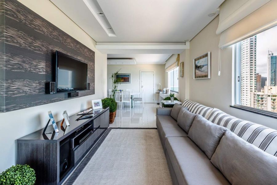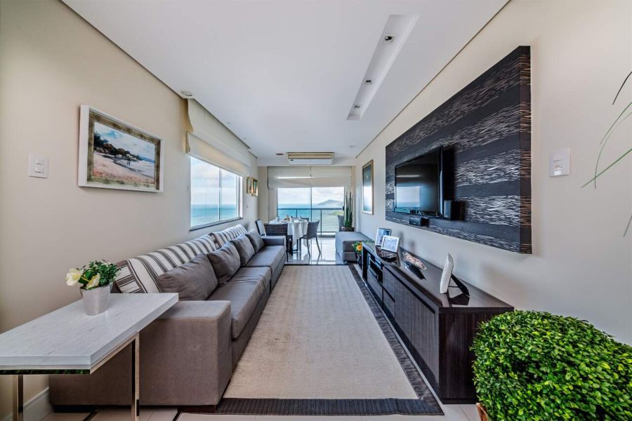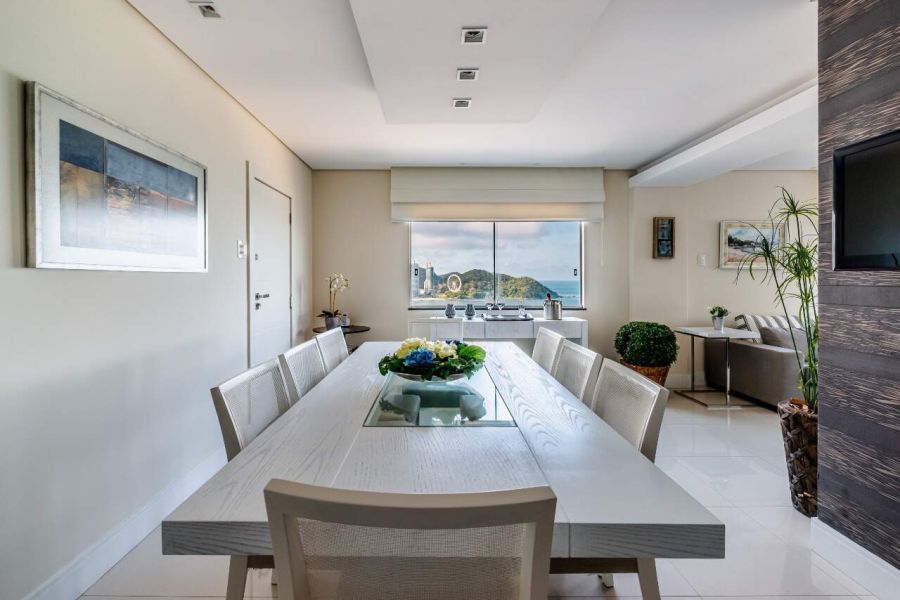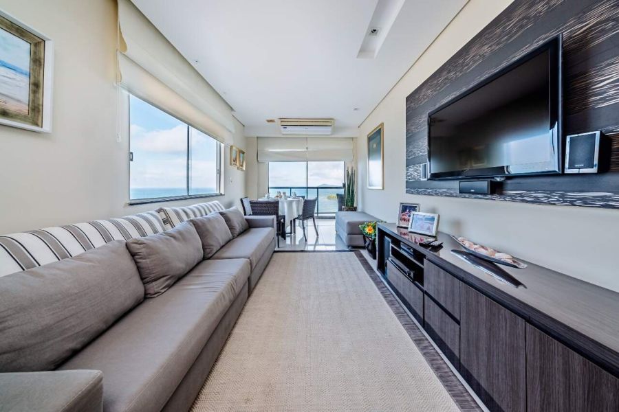 O apartamento à venda no Edifício Concorde é totalmente mobiliado e climatizado, com ambientes amplos e integração perfeita entre sala de estar, jantar e varanda panorâmica.