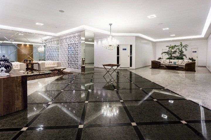 O hall social do Edifício Saint Antoine é um verdadeiro cartão de visitas. Com acabamento em granito polido, espelhos decorativos e lustre clássico, o ambiente transmite requinte e acolhimento. A iluminação embutida destaca cada detalhe, enquanto os móveis finamente escolhidos reforçam o alto padrão do empreendimento.