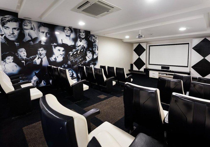 Com poltronas reclináveis, sistema de projeção profissional e iluminação cênica, a sala de cinema proporciona uma experiência imersiva dentro do próprio condomínio. A decoração temática homenageia ícones da sétima arte e cria um ambiente envolvente para toda a família.