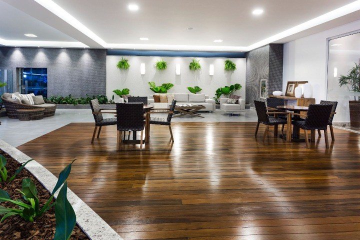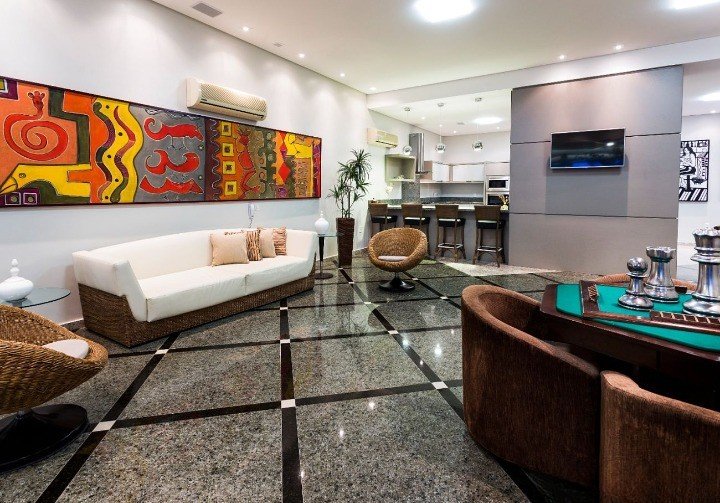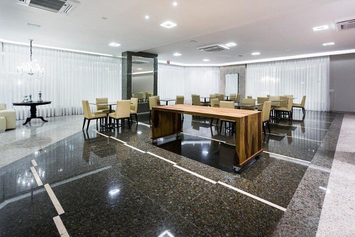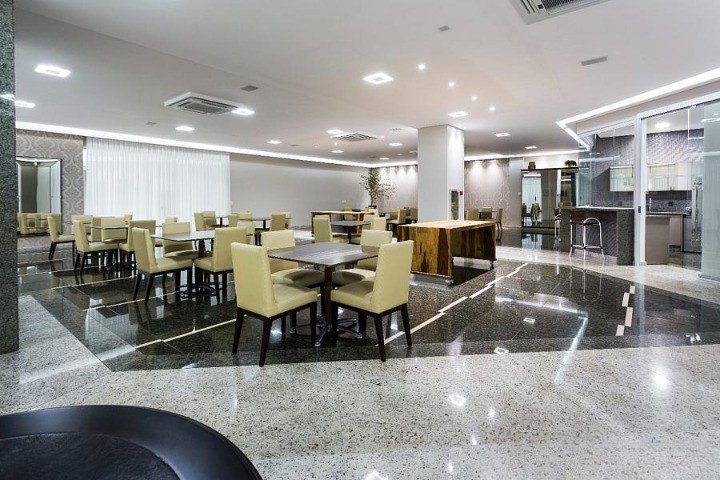 Com piso em granito, cortinas translúcidas e mobiliário neutro, o salão de festas permite personalizações para diversos tipos de eventos. A iluminação natural e o ambiente bem planejado garantem o sucesso de qualquer comemoração.