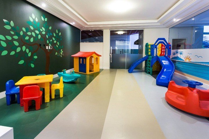A brinquedoteca é um ambiente encantador, com parede tematizada, escorregador, casinha de faz de conta e mesa para atividades. Colorido e seguro, o espaço foi projetado para estimular a criatividade e proporcionar interação entre as crianças, oferecendo tranquilidade para as famílias.